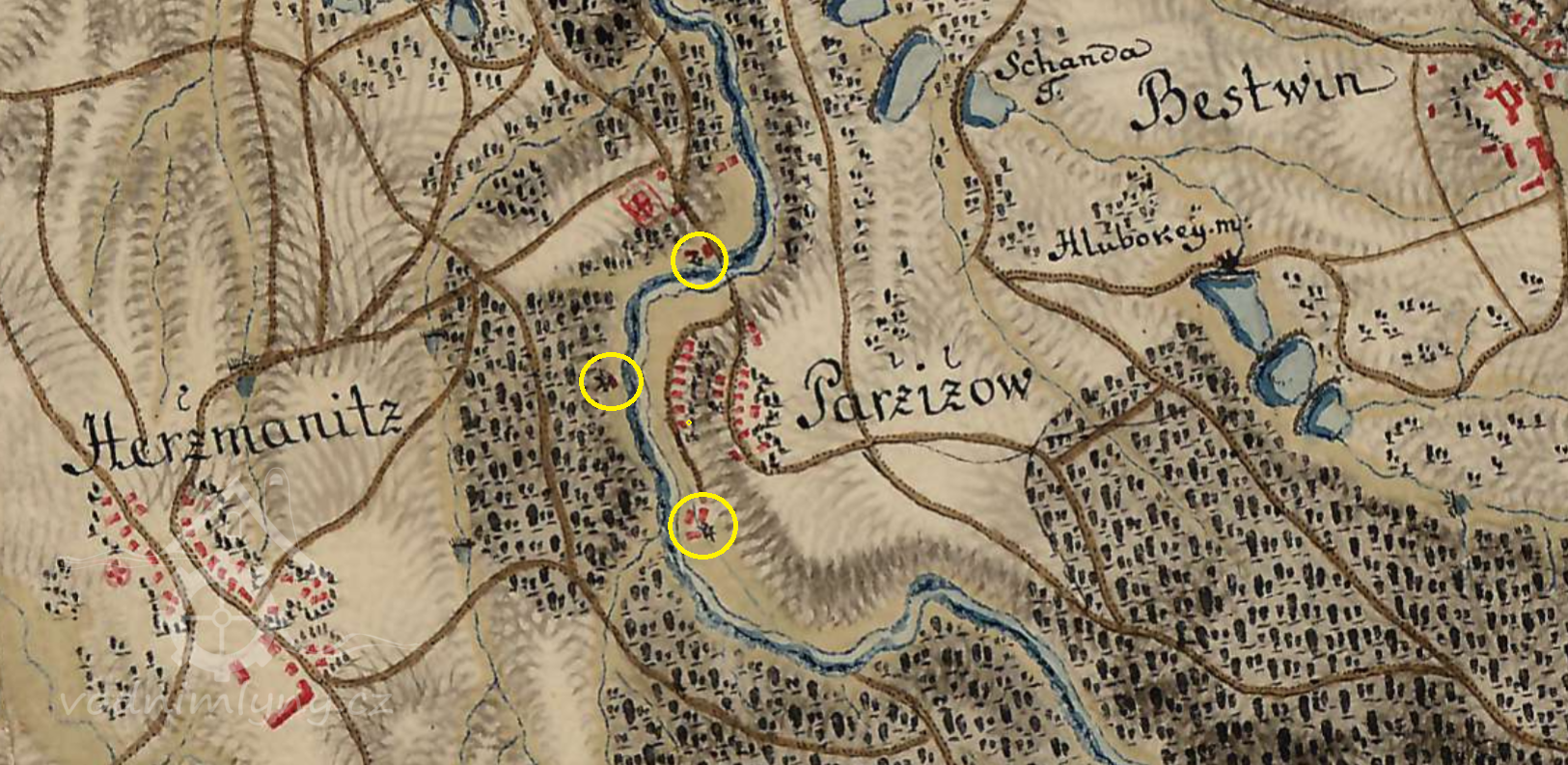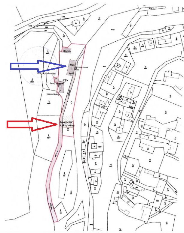 Jde o úzké a na sebe navazující pozemky mezi korytem řeky a nynějším náhonem, které obsahují vyvýšenou plošinu, pravděpodobně terénní pozůstatky staršího vyhořelého mlýna středověkého původu, který ještě v 19. století měl tři složení se třemi koly na vrchní vodu o průměru 189 cm a šířce 143 cm. Pozemky přímo navazují na pozemek st. pare. č. 1 se stojícím mlýnem č. p. 9 a spolu s ním tvoří logický historicky vzniklý a funkční celek.