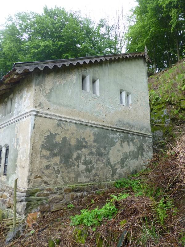 Menší přízemní objekt chlévů s polopatrem a pultovou střechou přiléhá zadní stranou ke svahu. Je vystavěný z lomového kamene a má uvnitř jediný prostor zastropený segmentovými cihelnými klenbami do traverz a nad ním v podkroví volný prostor využívaný pravděpodobně jako seník (s přístupem dvířky z fasády).