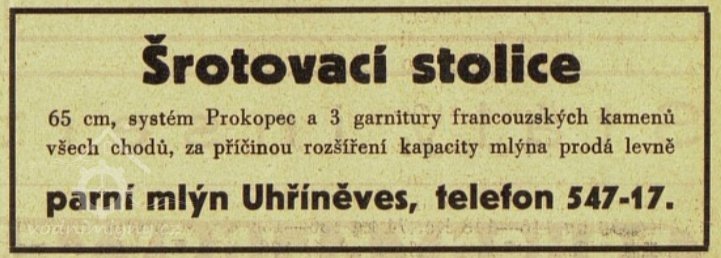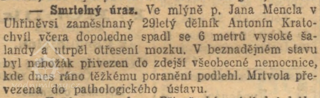 Elektrické světlo v Uhříněvsi. Píše se nám: Majetník zdejšího parního mlýna p. Jan Mencl zavedl nákladem velmi značným elektrické osvětlení veškerých mlýnských, jakož i svých obydlených místností a zároveň dal před mlýnem na náměstí zříditi jednu velkou Křižíkovu svítilnu, kteráž svým velmi intensivním světlem téměř celé okolí parního mlýna krásně osvětluje. Příkladu toho bude následovati dle doslechu příštího roku zdejší rolnický cukrovat, a tak máme naději, že celé městečko na místě petroleje elektrickým světlem osvětlováno bude, ježto by pak správa cukrovaru proti přiměřené náhradě osvětlování v obci převzala. Pěkné nové chodníky, elektrické osvětlení, nuže, která z blízkých i vzdálenějších obcí se naší Uhříněvsi vyrovná?!