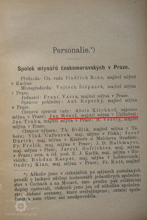 1898 - Jan Mencl, člen správní rady Spolku mlynářů českomoravských v Praze (Fr. Duška - Kapesní kalendář mýnů česko-moravských, 1899)