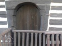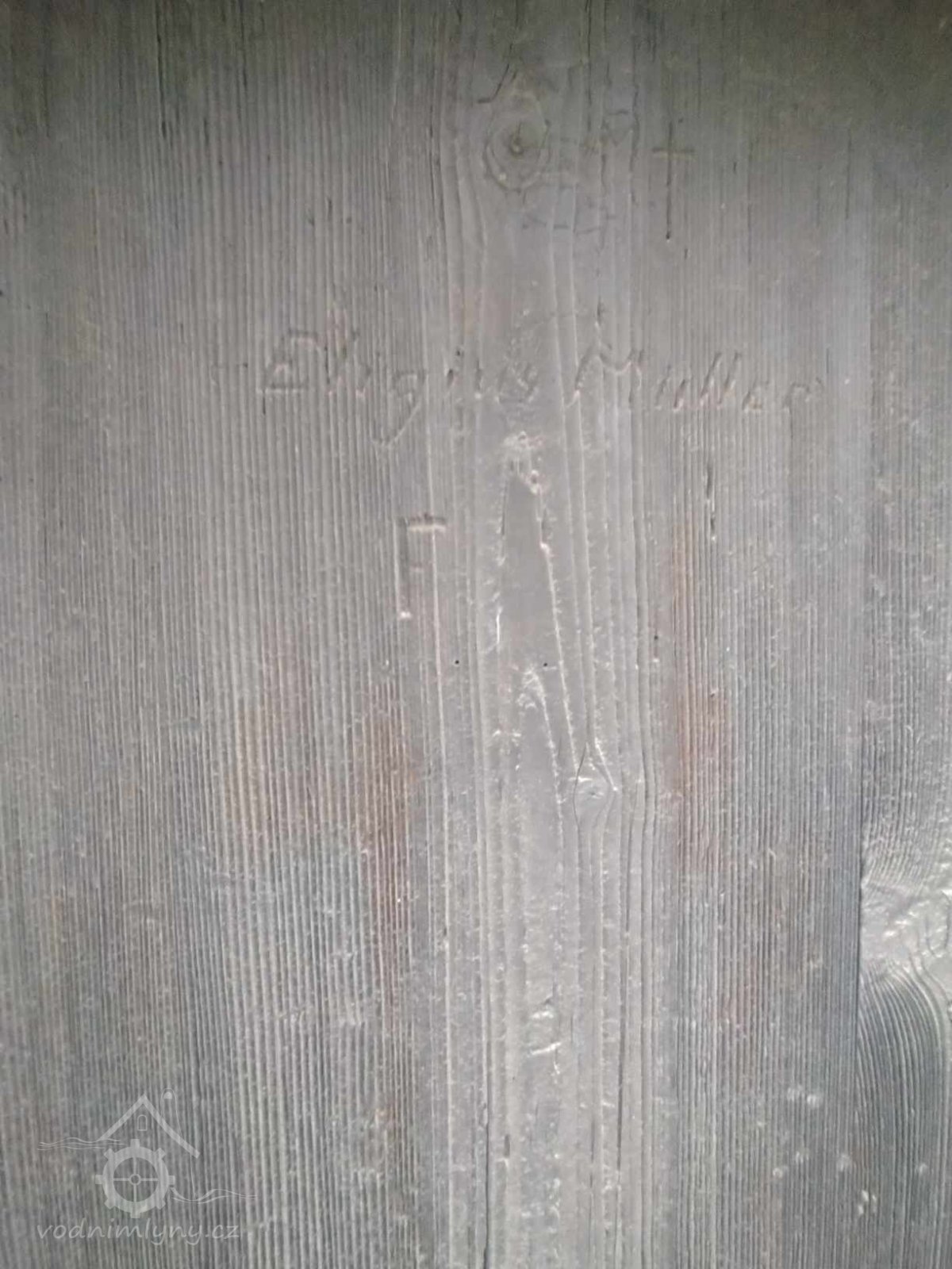Vyškrábaný nápis na dveřích: "Eligius Müller F"