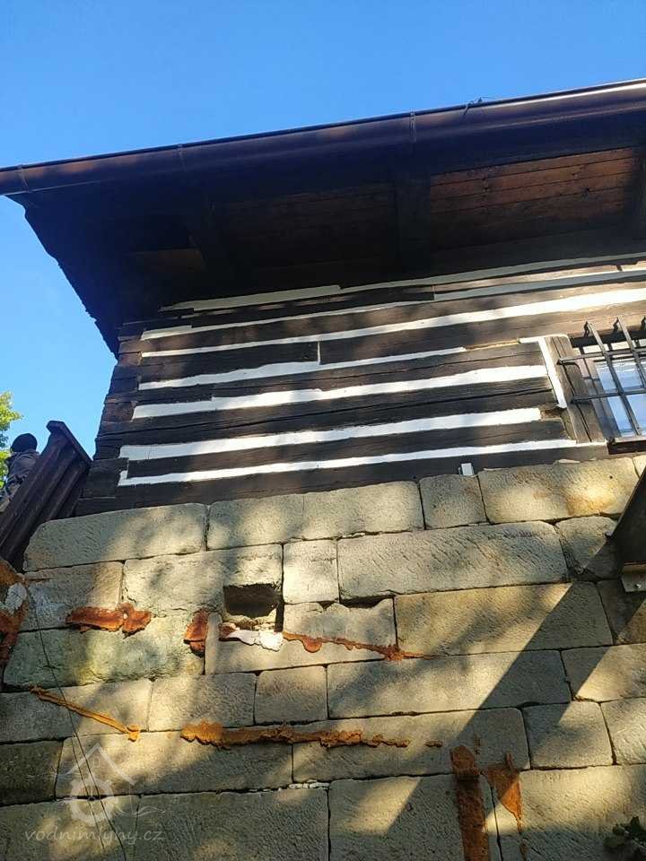 Roubený patrový mlýn s mohutnou mlýnskou lednicí.
