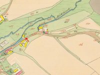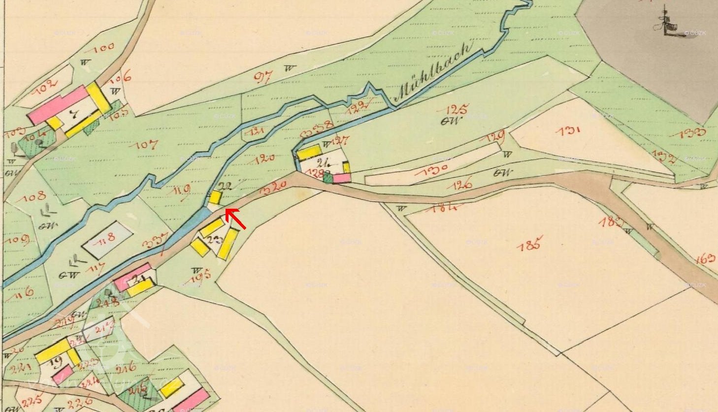 Mlýn o jednom složení zmiňovaný již v berní rule v roce 1651. Kdysi vlastnicky k mlýnu patřila i pila, která částečně existovala jako samostatná usedlost. Byla odprodána na začátku 19. století. Mlýn zanikl kolem roku 1865, kdy bylo pravděpodobně odprodáno i strojní vybavení k usedlosti pily. Poté objekt existoval jako uzavřené zemědělské stavení skládající se ze třech budov ze spalného materiálu. Dnes není po žádné z budov ani památky.