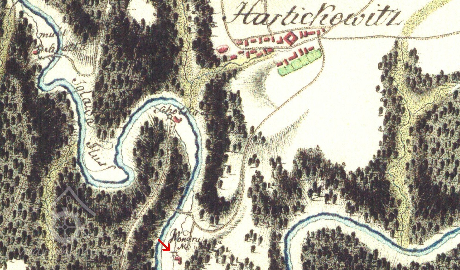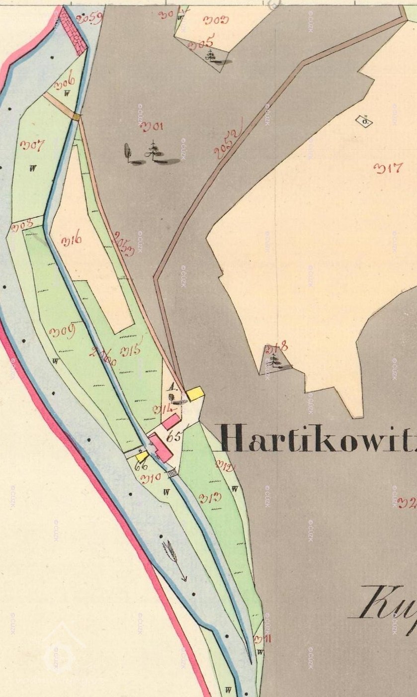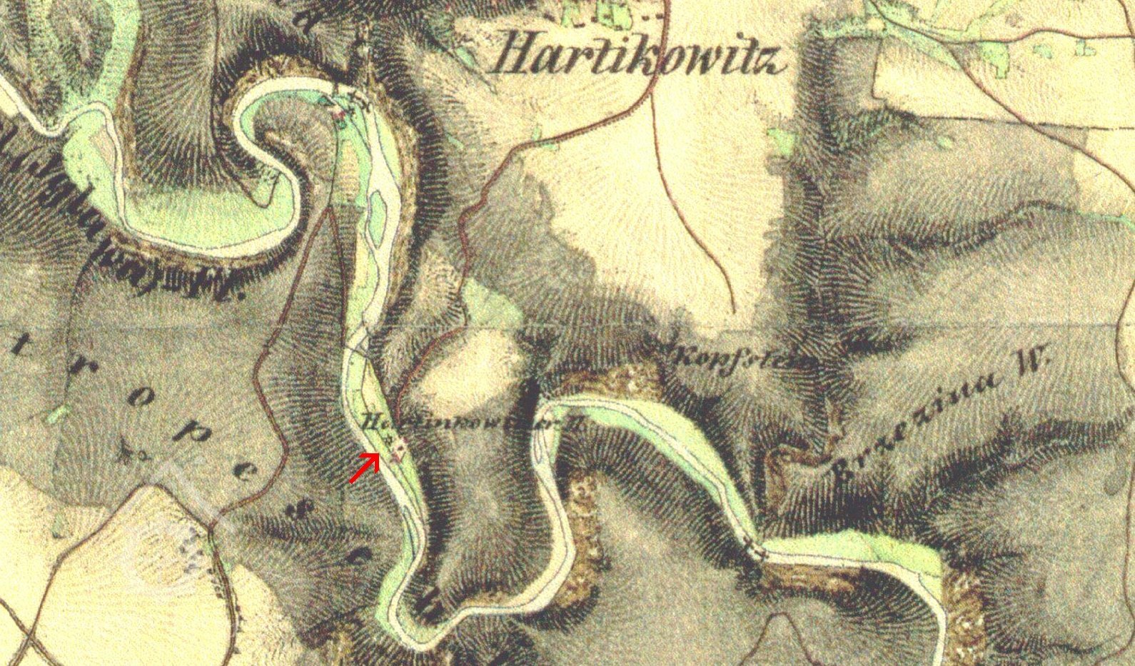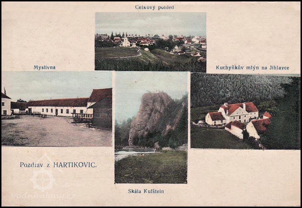 Hartvíkovický mlýn (Loupalův, Fialův, Kuchynkův). Hartvíkovický mlýn byl postaven nákladem vrchnosti pro mlynáře Jana a Jiřího Loupala v roce 1744. Roku 1789 byla přistavěna pila. Od roku 1809 působil na mlýně mlynář Jiří Loupal mladší, který u mlýna postavil dva kříže. První kříž z roku 1838, který stál před mlýnem, byl při napouštění přehrady přemístěn na louku k tzv. Hartvíkovické pláži