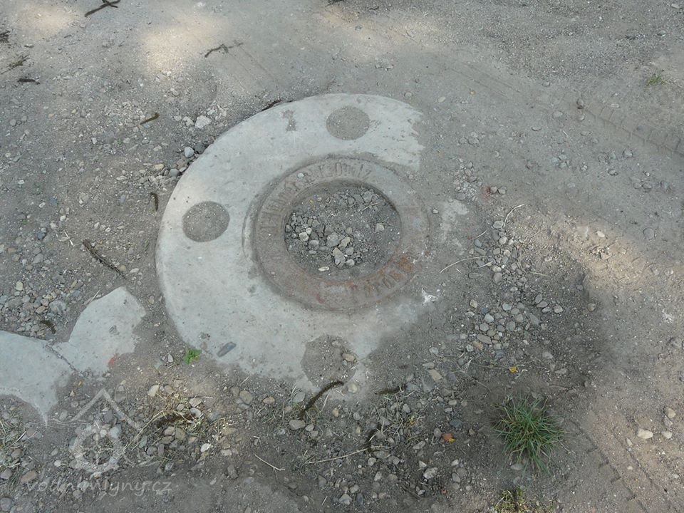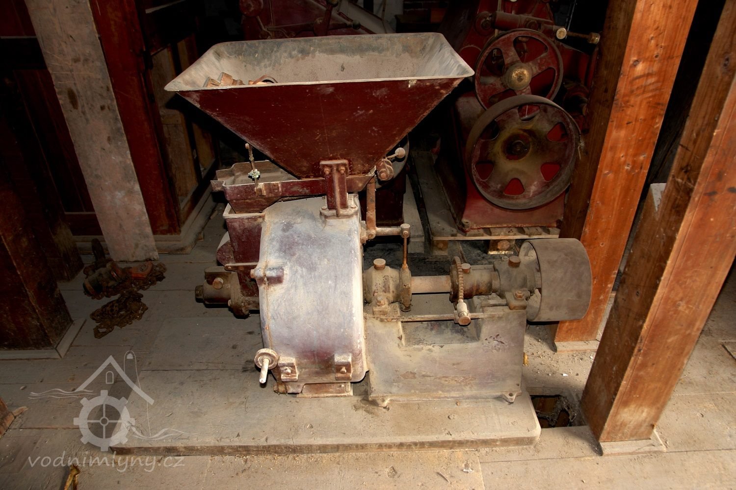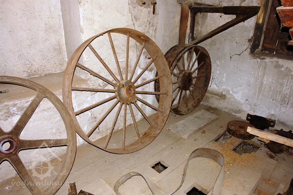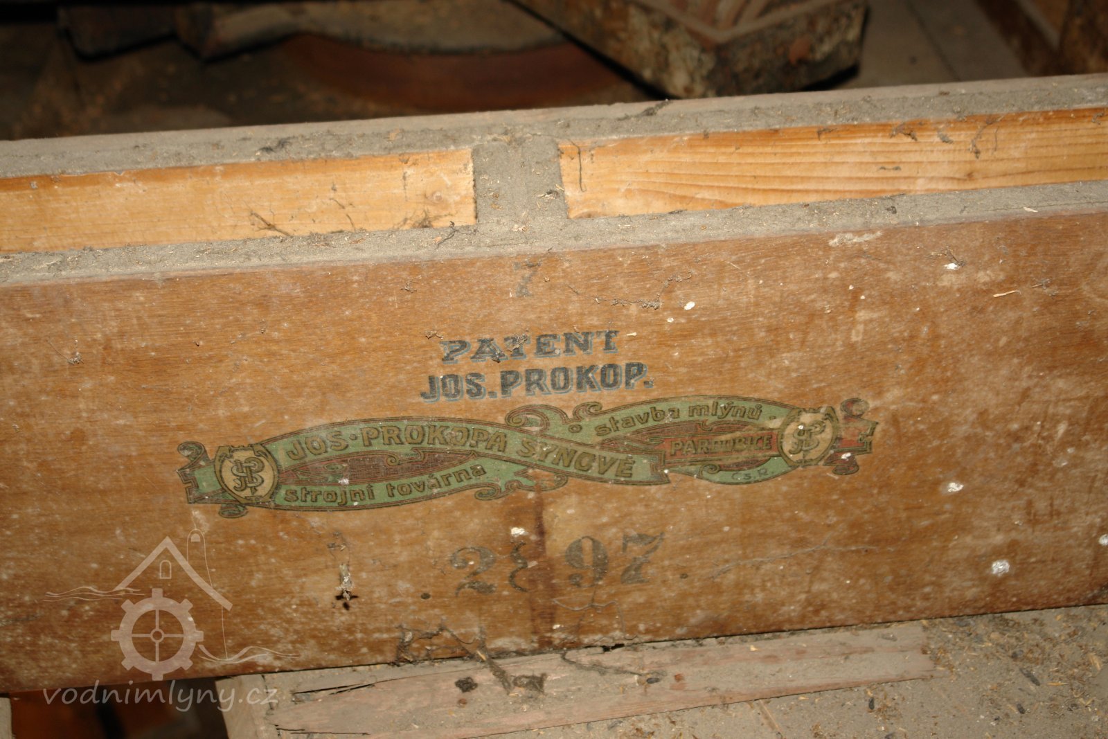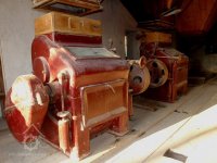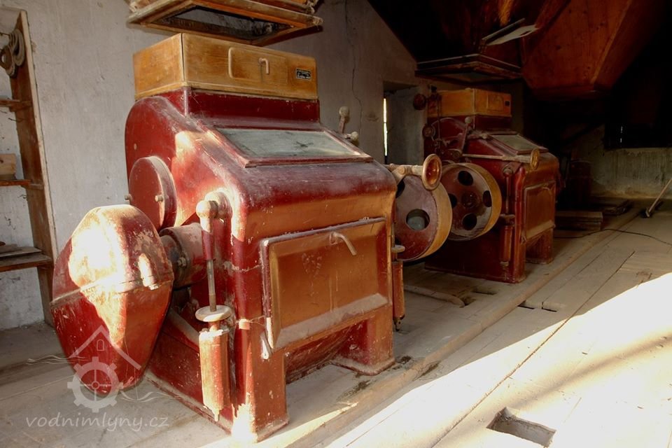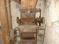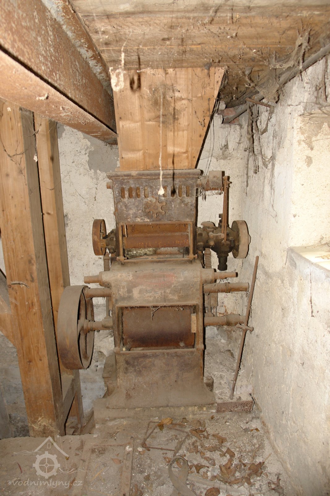 Mlýnská stolice v podzemí, 12.10.2015, © Radek, (Prvky na obrázku: válcová stolice, značka výrobce na technologickém vybavení)