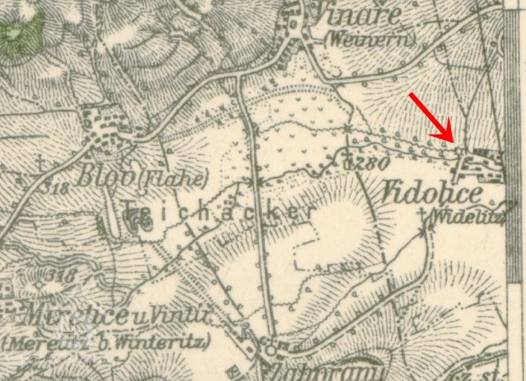 Dnes již zaniklý mlýn v obci Vidolice nedaleko Pětipes stál ještě v roce 1952.