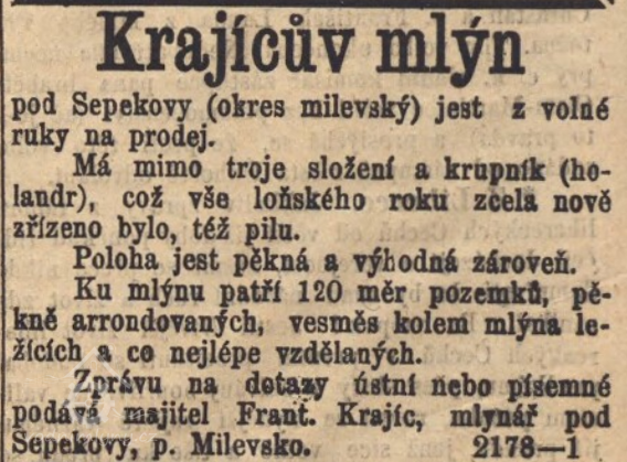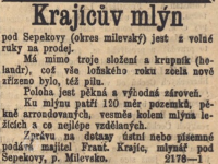 V roce 1869 nabízel mlynář František Krajíc mlýn na prodej. (RR)