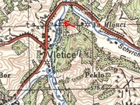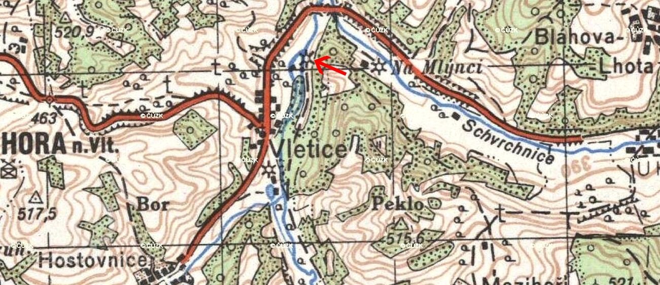 Mlýn se nachází oděleně na severním okraji Vletic.