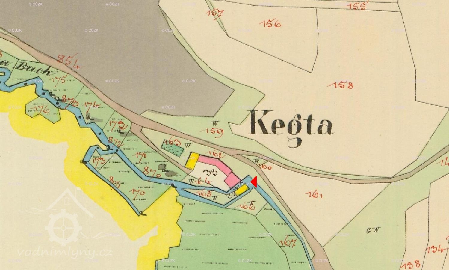 Na počátku náhonu není stavidel, jez přepadní je v levém břehu potoka. Nad vantroky samými je v levém břehu mlýnské strouhy jalové stavidlo... Vantroky jsou dřevěné ve světlosti 1,48 m široké, 4 m dlouhé a 0,55 m hluboké. Z nich stavidly vede se voda do žlabů. Bývalá okenice ke třetímu žlabu na bývalé třetí vodní kolo je zahražena. Stavidlo v náhoně dříve vodu na bývalou pilu vedená slouží co jalové. Voda od kol odpadající spojuje se hned pod mlýnem s jalovým potokem