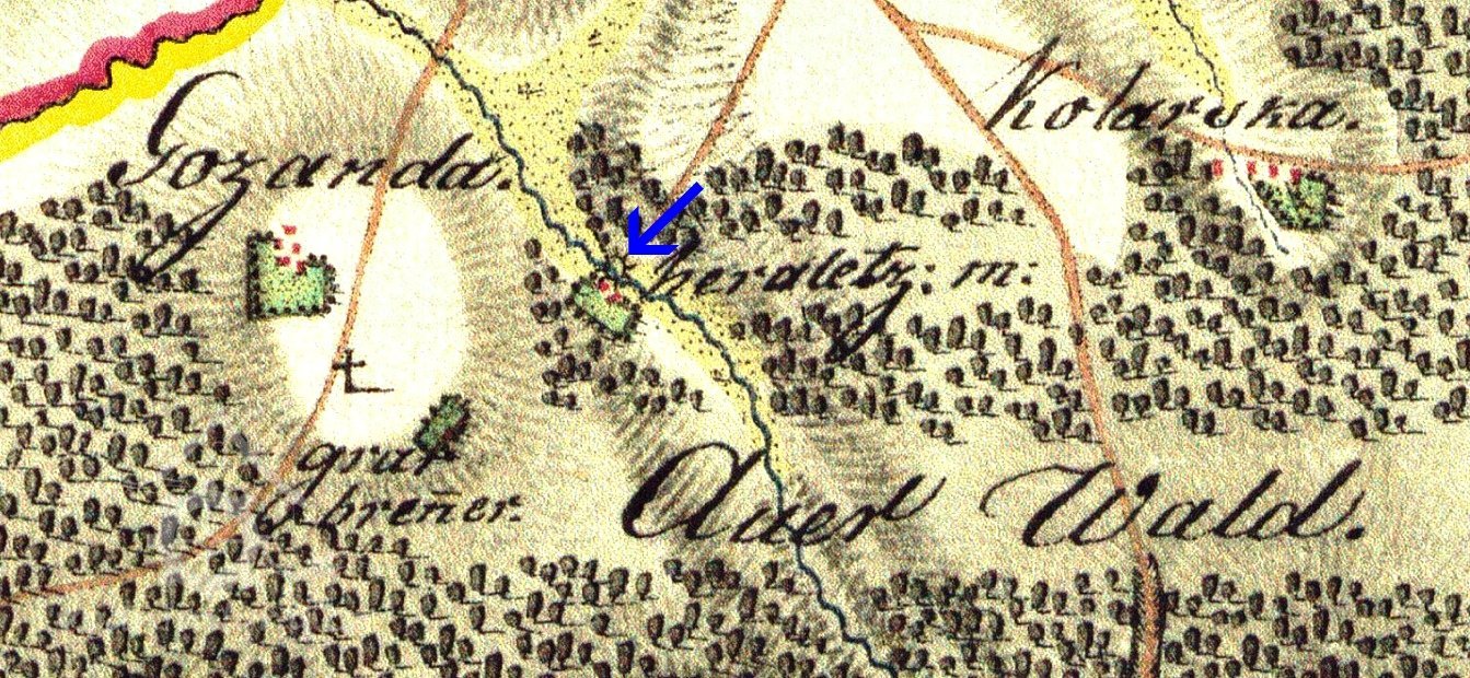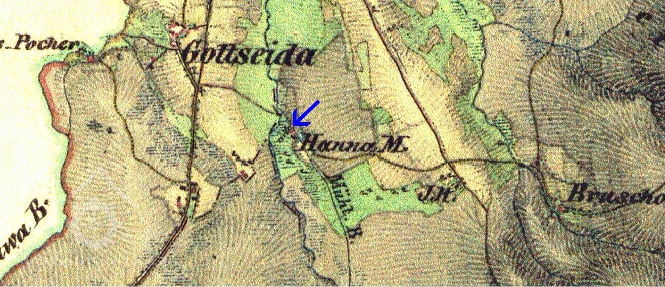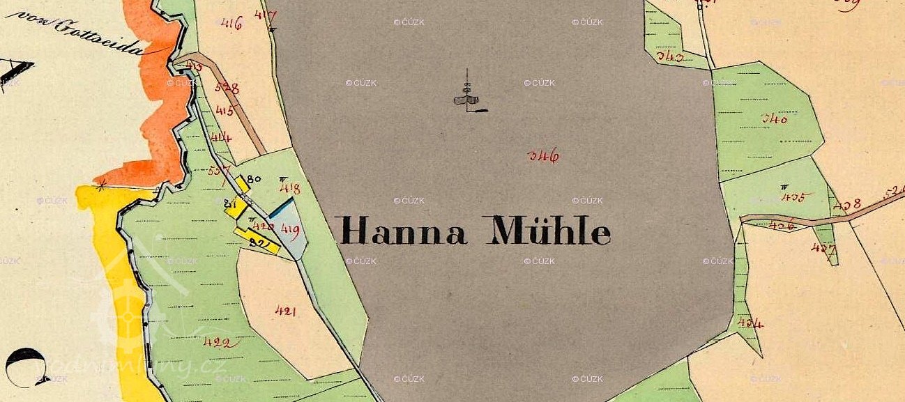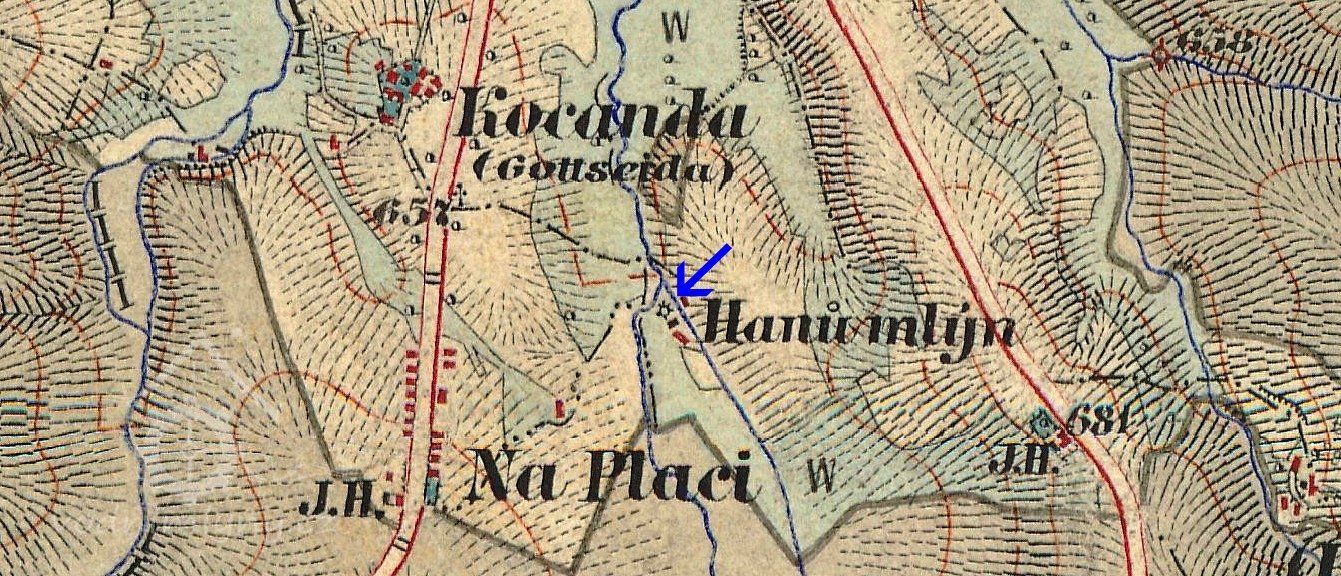 Mlýn se nachází na samotě poblíž osady Kocanda (Gottseida).