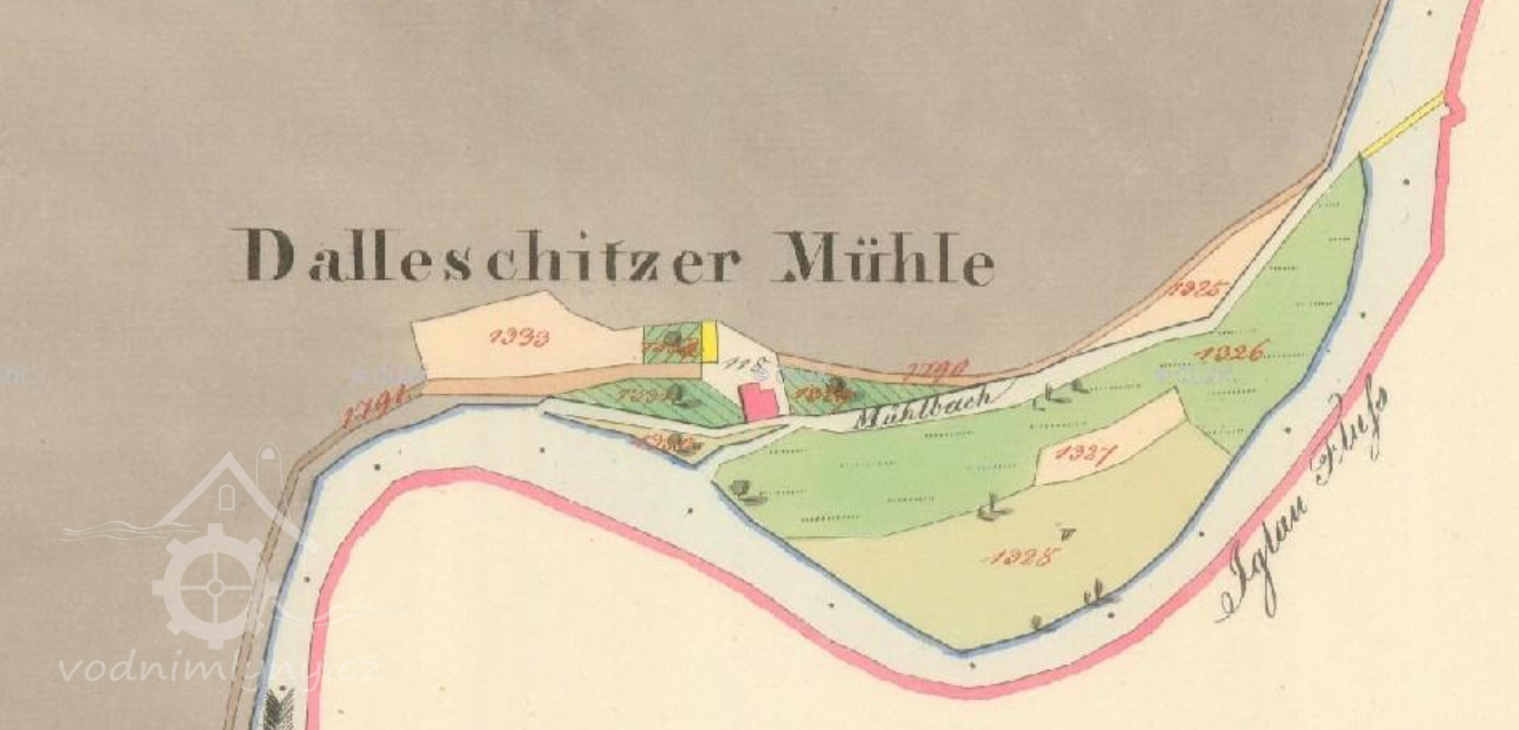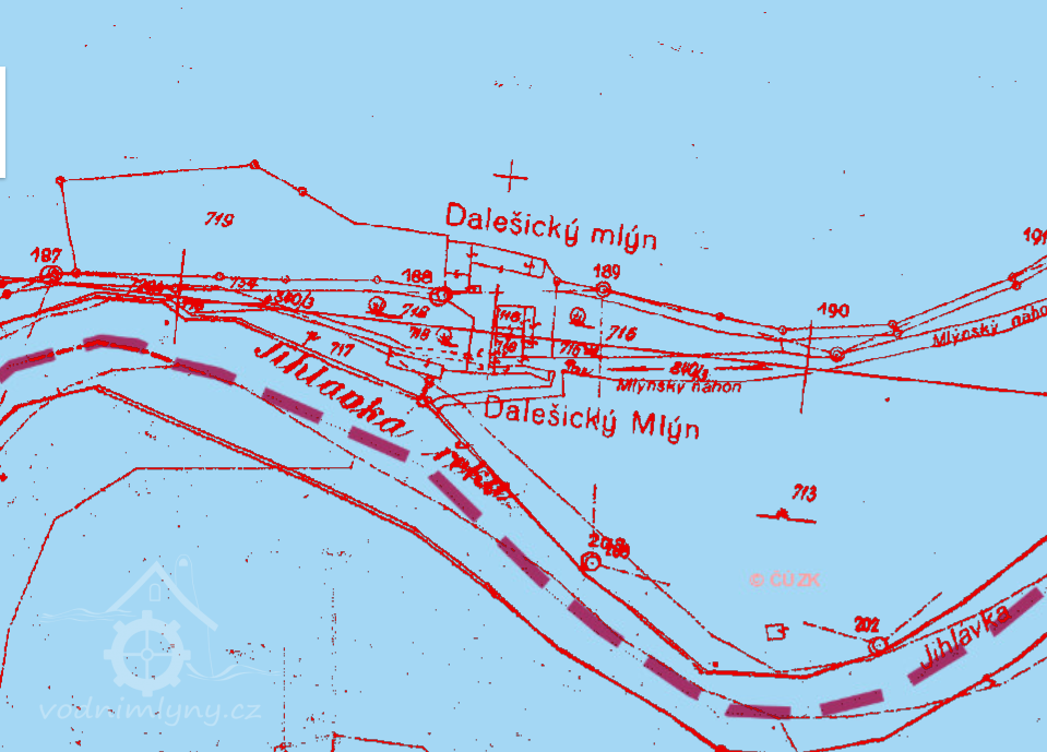Dalešický mlýn (Stejskalův, Davidův). Rod Stejskalů se na Dalešický mlýn přistěhoval v roce 1540 a držel se na něm do roku 1850. Davidovi se na mlýn přistěhovali okolo roku 1900. Poslední mlynář David ukrýval účastníky atentátu na Heydricha a v březnu 1943 byl uvězněn na Pankráci spolu s Potůčkem a Denemarkem a později byli všichni tři popraveni. Jeho žena byla dána do pracovního tábora, kde zažila mnoho hrůz a po válce se zbědovaná a vyhublá vrátila. Dalešický mlýn a pila od roku 1943 do provozu uvedeny nebyly. Mlýn byl poháněn Francisovou turbínou, na mletí měl válcové stolice. Pila stála při mlýně od pradávna, byla zastaralá jednolistová. Mlýn byl zatopen roku 1970.
