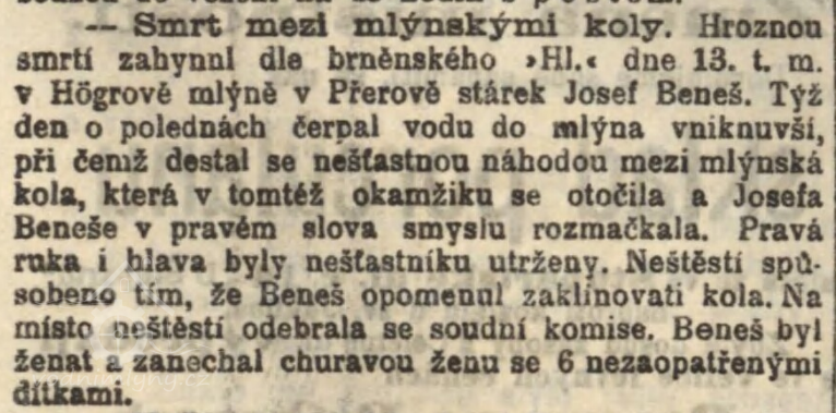 1891 stárek Josef Beneš rozmačkán mlýnskými koly. (RR)
