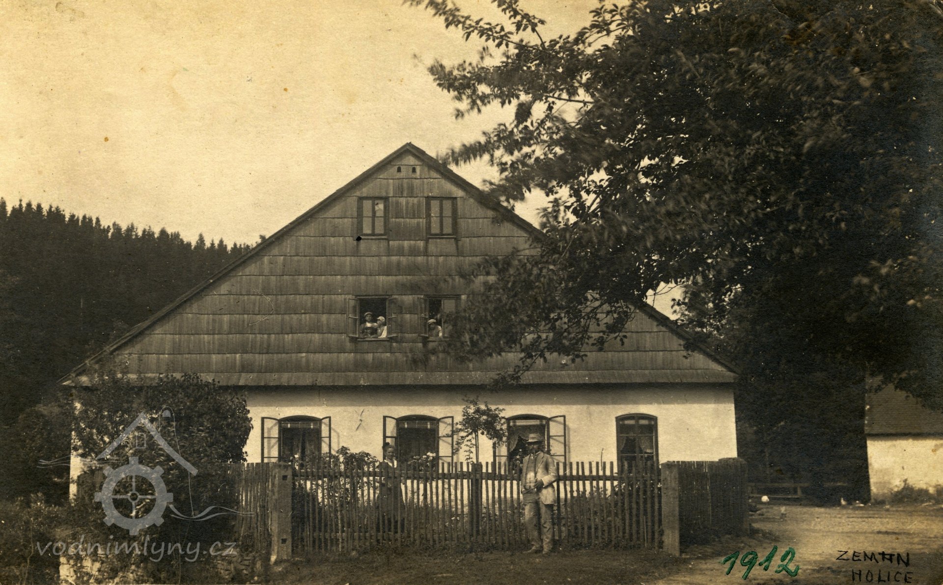 Pohled na mlýn, v popředí mlynář František Zeman, 1912, © neznámý, ze sbírky Jiřího Zemana
