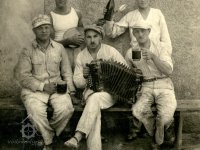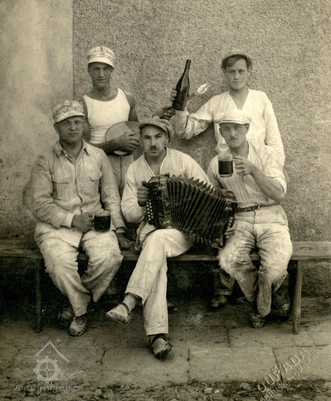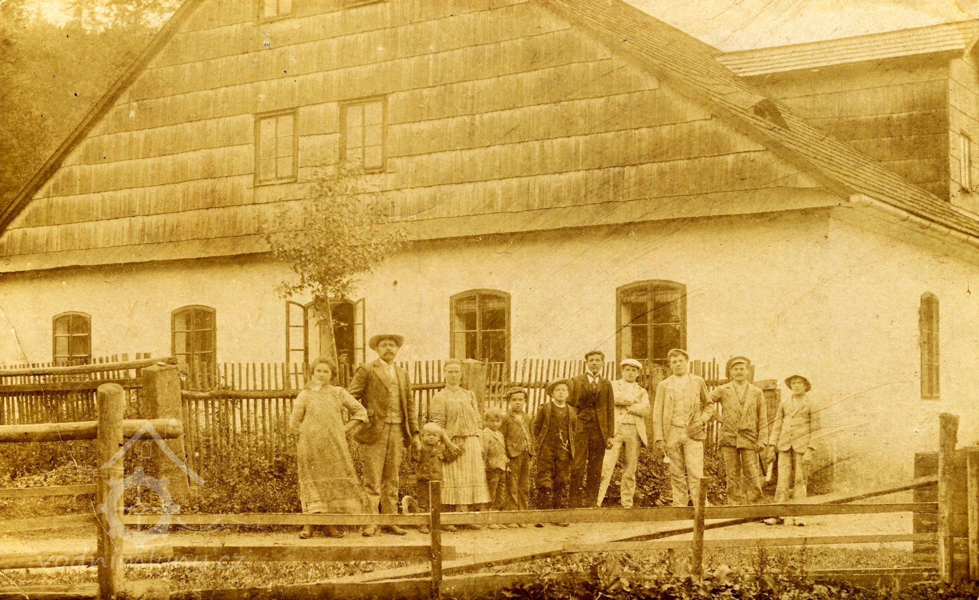 Snímek mlýna s Františkem Zemanem a s celou rodinou i chasou, nedatováno, © neznámý, ze sbírky Jiřího Zemana