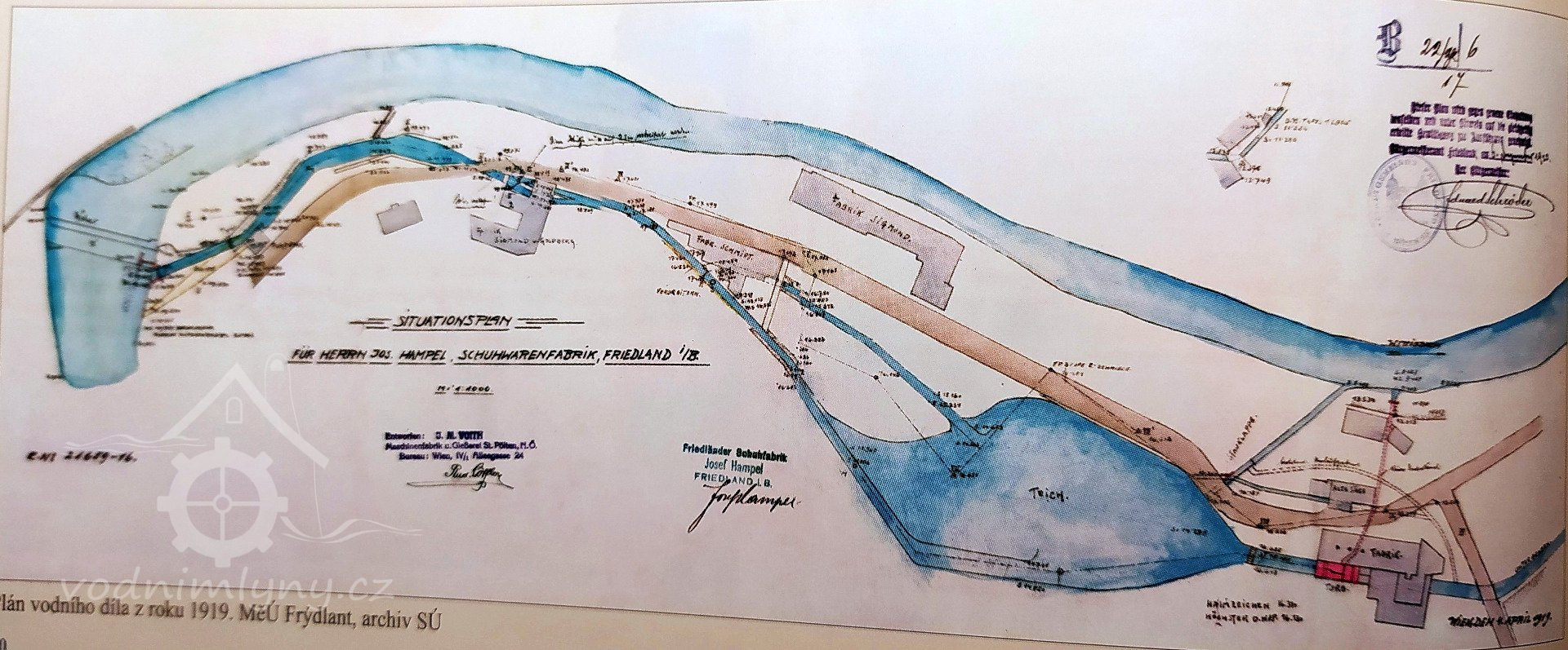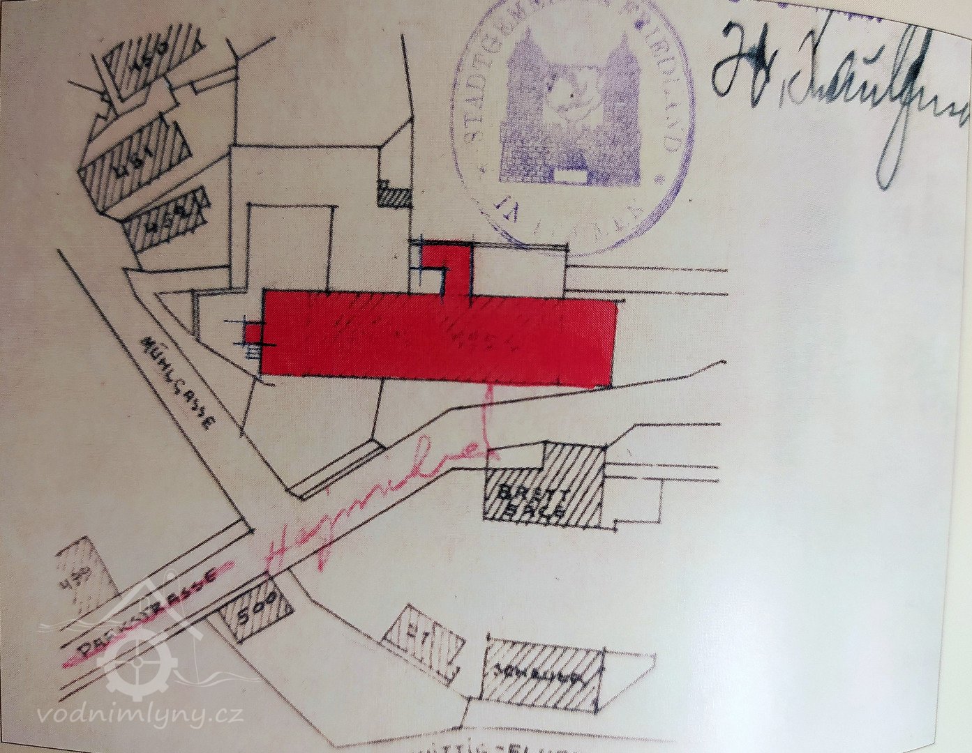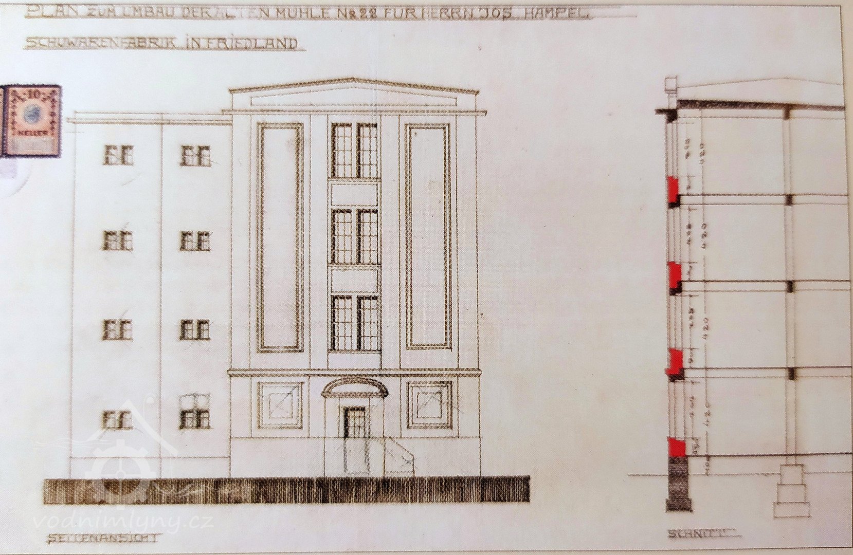 1916 zakoupil Josef Hampel, mlýn nechal zbořit a na jeho základech vysatvěl etážovou budovu továrny na obuv.