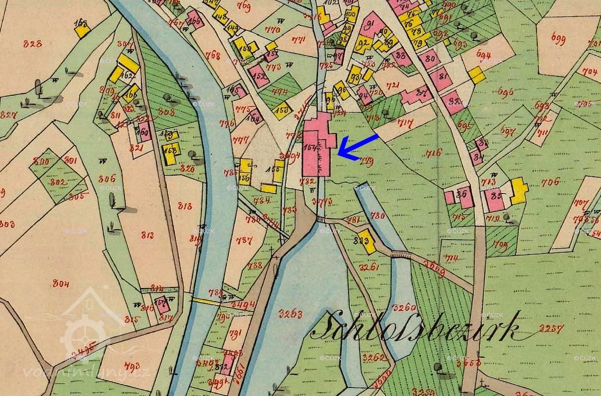 Roku 1930 zde byla Francisova turbína o hltnosti 1400 l/s., spád 4 m, výkon: 57,5 HP.