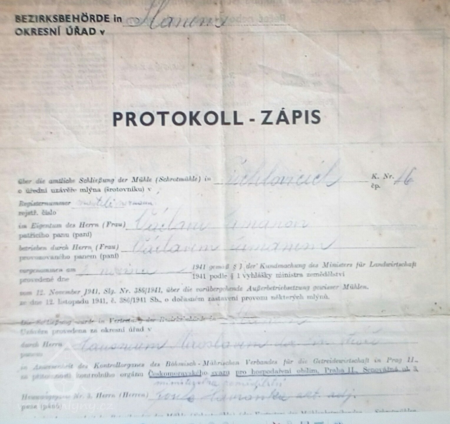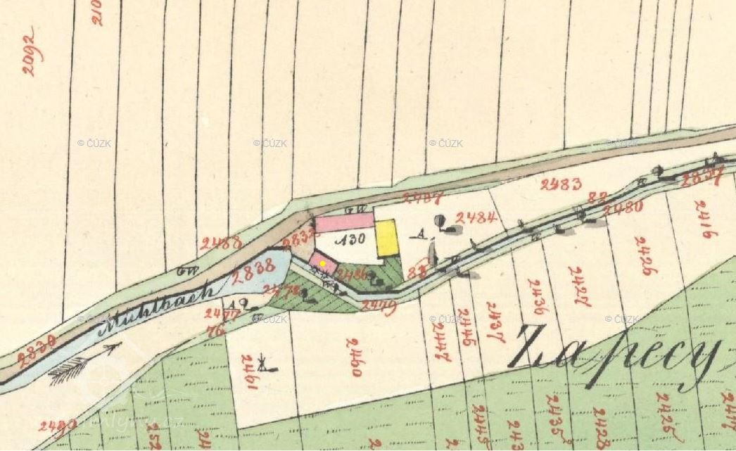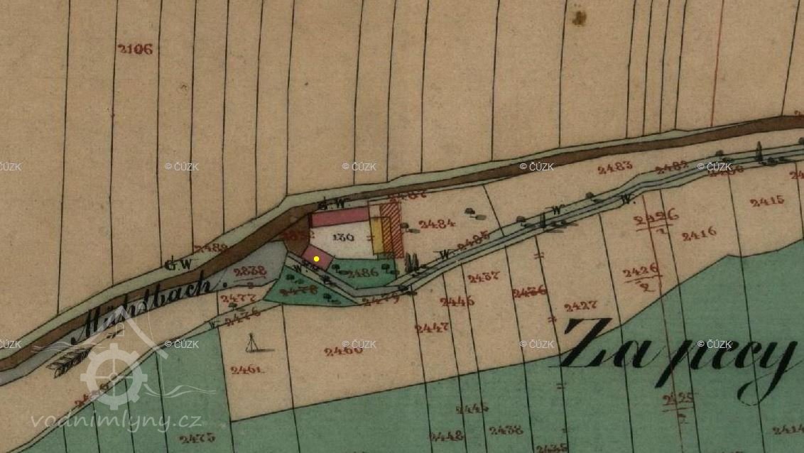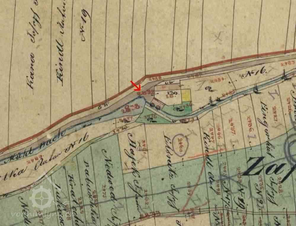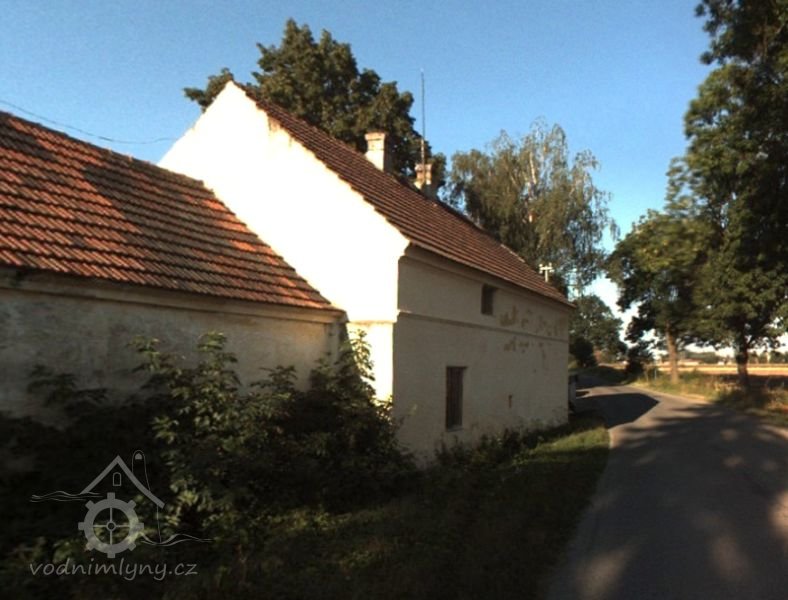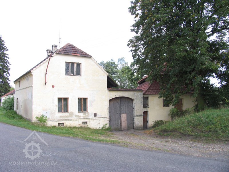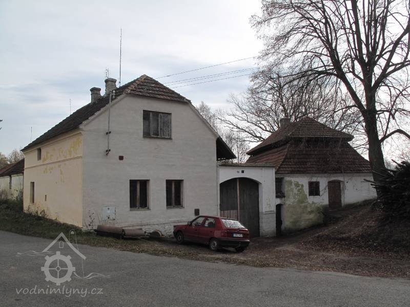 Od konce západní hospodářské budovy jde kamenná zeď, která navazuje na bývalou mlýnskou budovu. Vstupní západní průčelí areálu mlýna se skládá z brány s malou brankou po pravé straně, ze štítu levé obytné budovy a stěny pravé původně mlýnské budovy. Od brány jde mírně do kopce kameny dlážděná cesta, která ústí na místní komunikaci. Štít levé budovy má kamenný sokl zděný do kyklopského zdivá zakončený římsou z cihel. Zbytek štítu je hladký, do přízemí v něm osově vedou dvě dvoukřídlá dvojitá dřevěná nová okna. Nad nimi vede do patra podobné trojkřídlé rovněž nová okno. Mezi okny je nápis č. 16 a pod tím letopočet 1914. Štít je lemován římsou. Nahoře je zakončen vodorovně a dále z něj vybíhá půlvalba střechy.