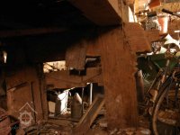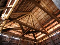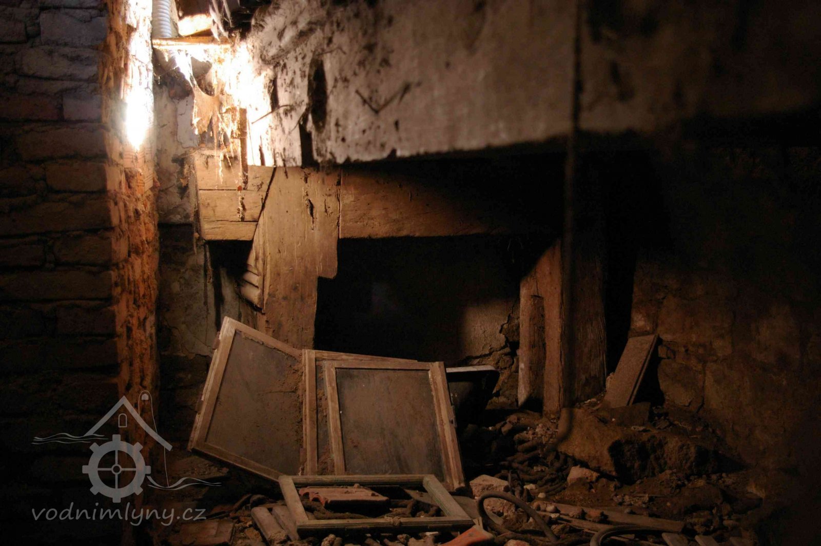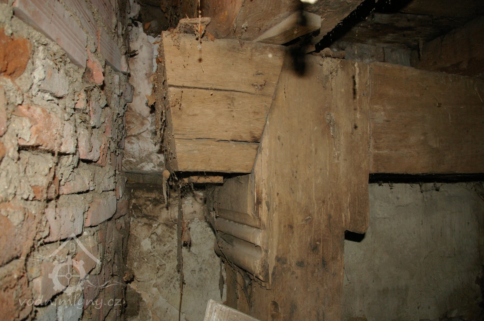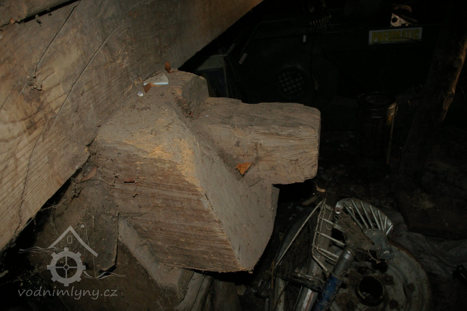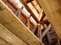 Podlahy v těchto místnostech jsou nové betonové. Stropy jsou ploché, nově omítané na lignopor upevněný na původních trámech. Do této budovy je ještě další vstup dřevěnými dvoukřídlými vraty na pravém konci dvorního průčelí. Za vraty je místnost probíhající přes celou šířku budovy, vybíhající na konci doleva o šířku předsíně. Podlaha je kamenná. Strop má rovněž nový heraklitový na původních trámech. Nad koncem místnosti jsou pouze stropní trámy skrz ně je vidět do krovu. Nad místnostmi v západní části budovy je dřevěná podlaha. Obvodové stěny západní části jsou v patře roubené z dřevěných trámů. Trámy jsou shnilé. Ze severní stěny vybíhají shnilé zbytky trámů do středu disposice. Mezi zdivém a trámy je velká trhlina. Rovněž zdivo |e místy poškozeno trhlinami. Krov je hanbalkový dřevěný, krytina je nová a drážkových tašek. Původní stropy místností jsou nízké. Všechny dveře a část oken jsou nové. Dveře jsou v ocelových zárubních.