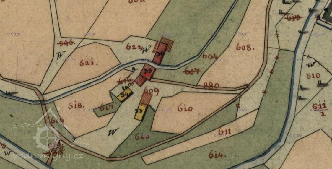 PopisV roce 1930 mlýn pohánělo 1 kolo na svrchní vodu, průtok 0.154 m3/s, spád 4.1 m, výkon 5.4 HP