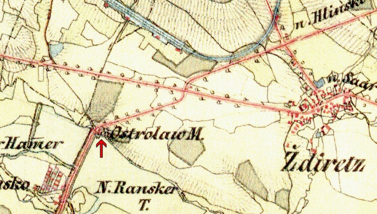„Ostrolovský mlýn, u rybníku stejného jména, který zde tvoří Doubravka. Mlýn s čp. 1 patří k obci Ždírec, panství Polná, čáslavský kraj. Leží čtvrthodiny západně od Ždírce a od Krucemburku je vzdálen třičtvrtěhodiny západně. Bydlí tu pouze mlynář spolu se svou rodinou, která se skládá z osmi katolických duší.“