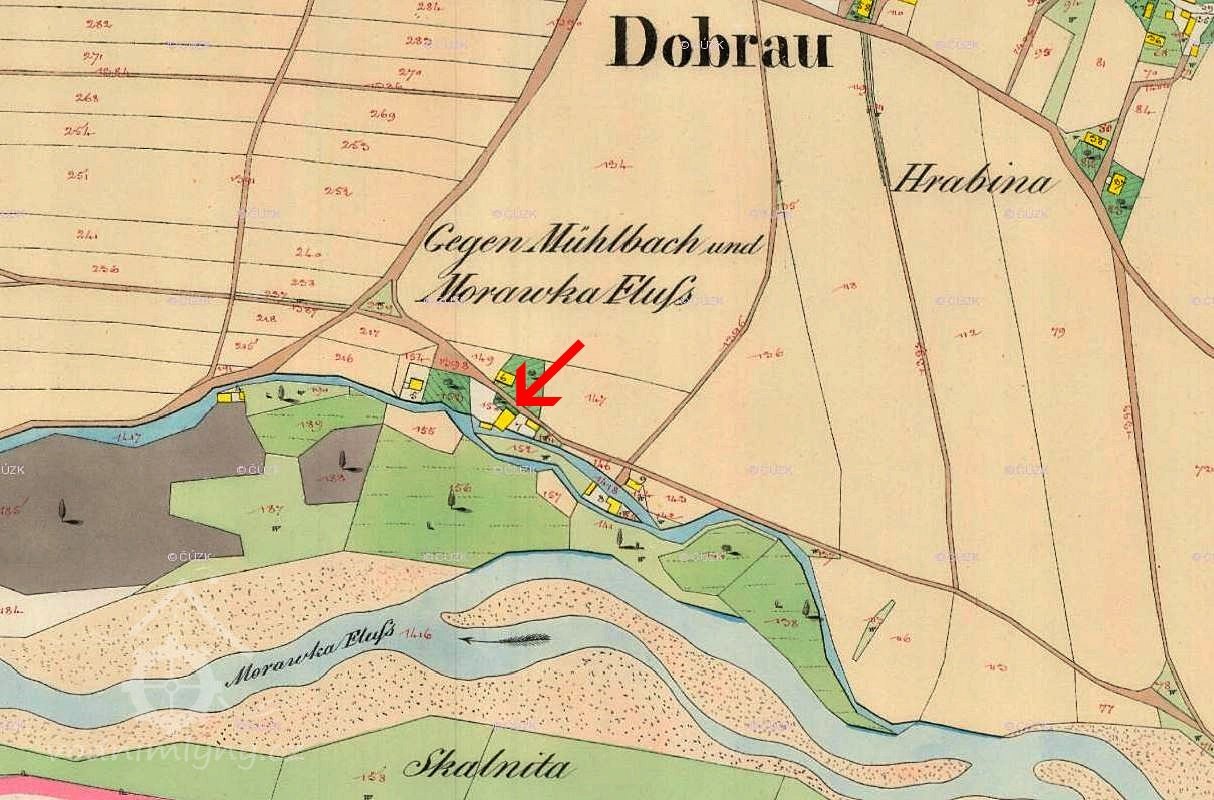 V urbáři z roku z roku 1636 víme, že vrchnost tento mlýn pronajímala za 40 zlatých ročně. Tehdy se píše: „Při té vsi jest mlýn panský o jednom kole, na nějž se z řeky Morávky voda vede; dává se z něj platu o svatém Jiří 20 zlatých a o svatém Václavu též 20 zlatých, však kdyby jaký kus dělal nový, jemu se mírně neb skromně platí neb z pronájmu sráží (změnil-li by nájemný mlynář svůj obrat, musí dát vrchnosti něco navíc anebo mu bude naopak sleveno ze 40 zlatých nájmu). Při tom mlýně se nachází pila, ku kteréž se podle nynějšího nařízení trámy vozí; každý trám po 18 grošů z dědin k tomu nařízených. Z Dobré 18 sedlákův po 5 trámích, z Nošovic 9 sedlákův po 5 trámích, z Nižní Lhoty 8 sedlákův po 5 trámích, z Vyšní Lhoty 6 sedlákův po 5 trámích, z Raškovic 6 sedlákův po 5 trámích, to jest ročně 235 trámů, každý po 18 groších, což vynáší vrchnosti 117 zlatých 18 grošů“.