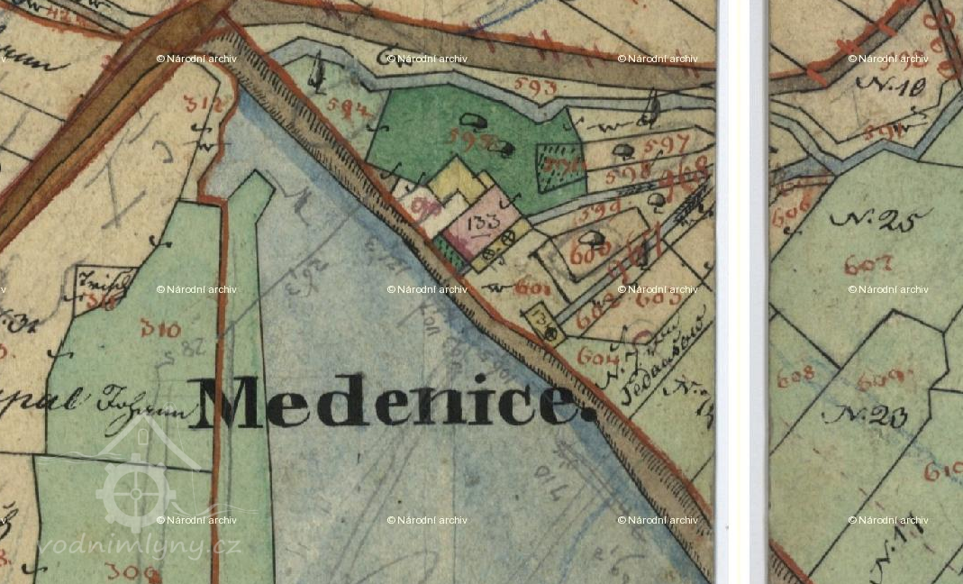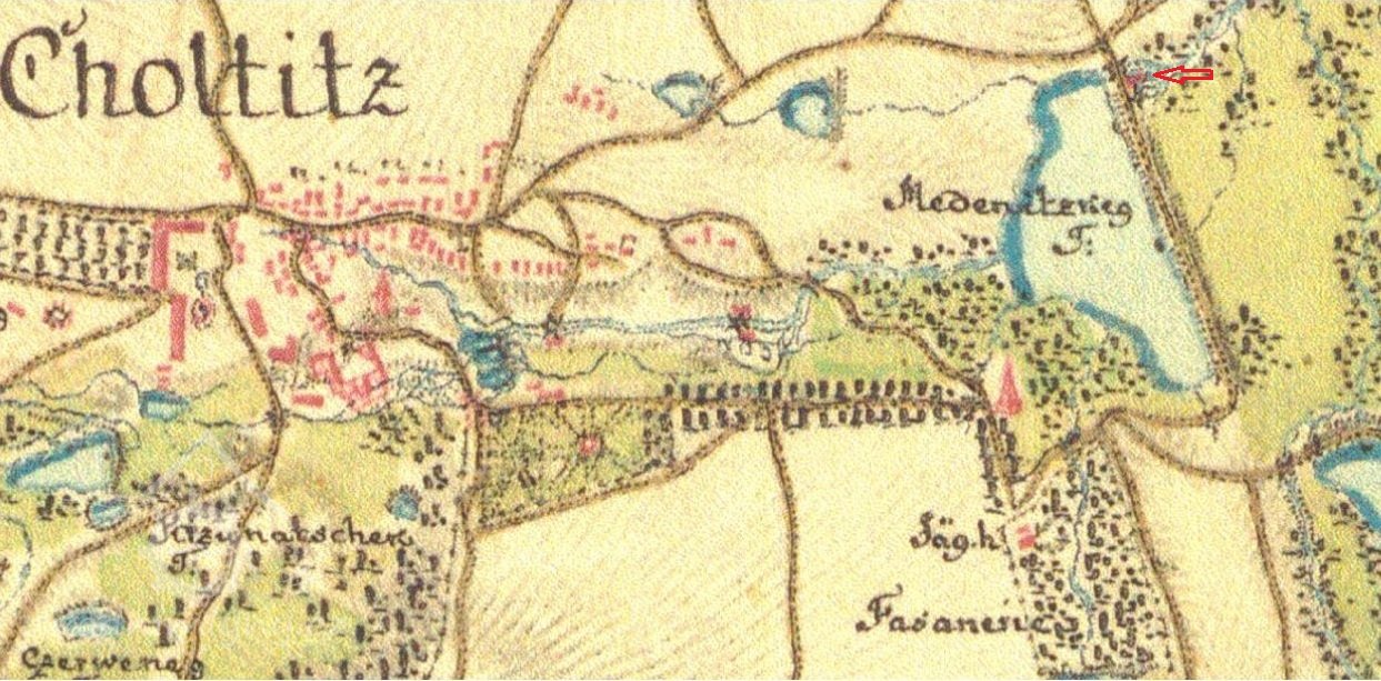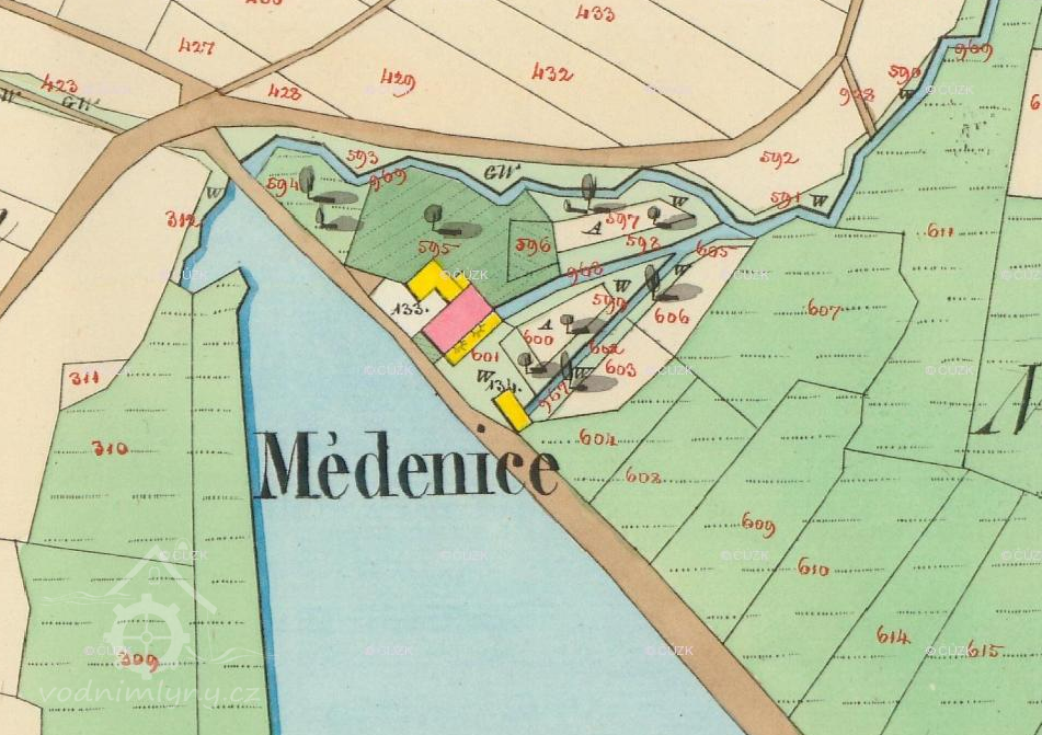 Z Choltického urbáře: "pod rybníkem Medenickým jest mlejn panskej se trojím moučnejm složením, jednou jahelkou a 4 stoupama; při tom jest pila, na které dosti prken pro potřebu domácí nařezati může."
