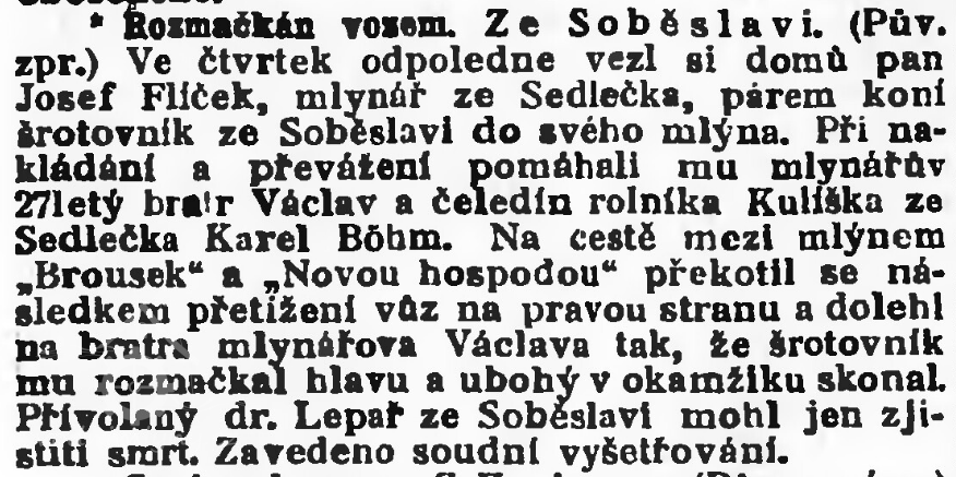 … R. 1901 mlýn vlastnil J. Veselý a potom Flíček, r. 1937 Hájek. A ještě před tím r. 1897 se stal z mlýna hostinec.