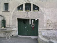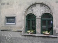Okno a pamětní deska, 2010, © https://commons.wikimedia.org/, (Prvky na obrázku: okno, plastická omítková výzdoba fasád a štítů)
