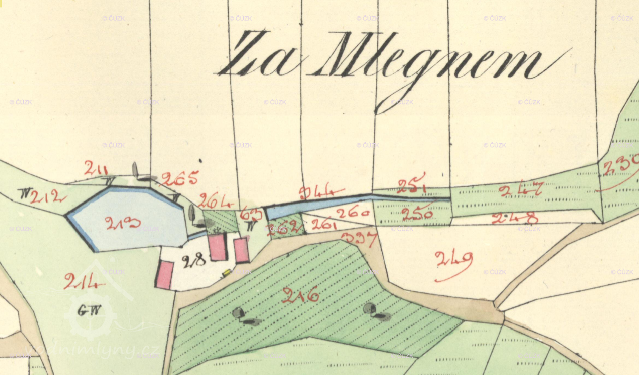 Z důvodu zcela nedostatečného průtoku vody v potoce (pramení pouhý kilometr nad mlýnem!) bylo nutno zřídit akumulační nádrž, zvanou Louže.