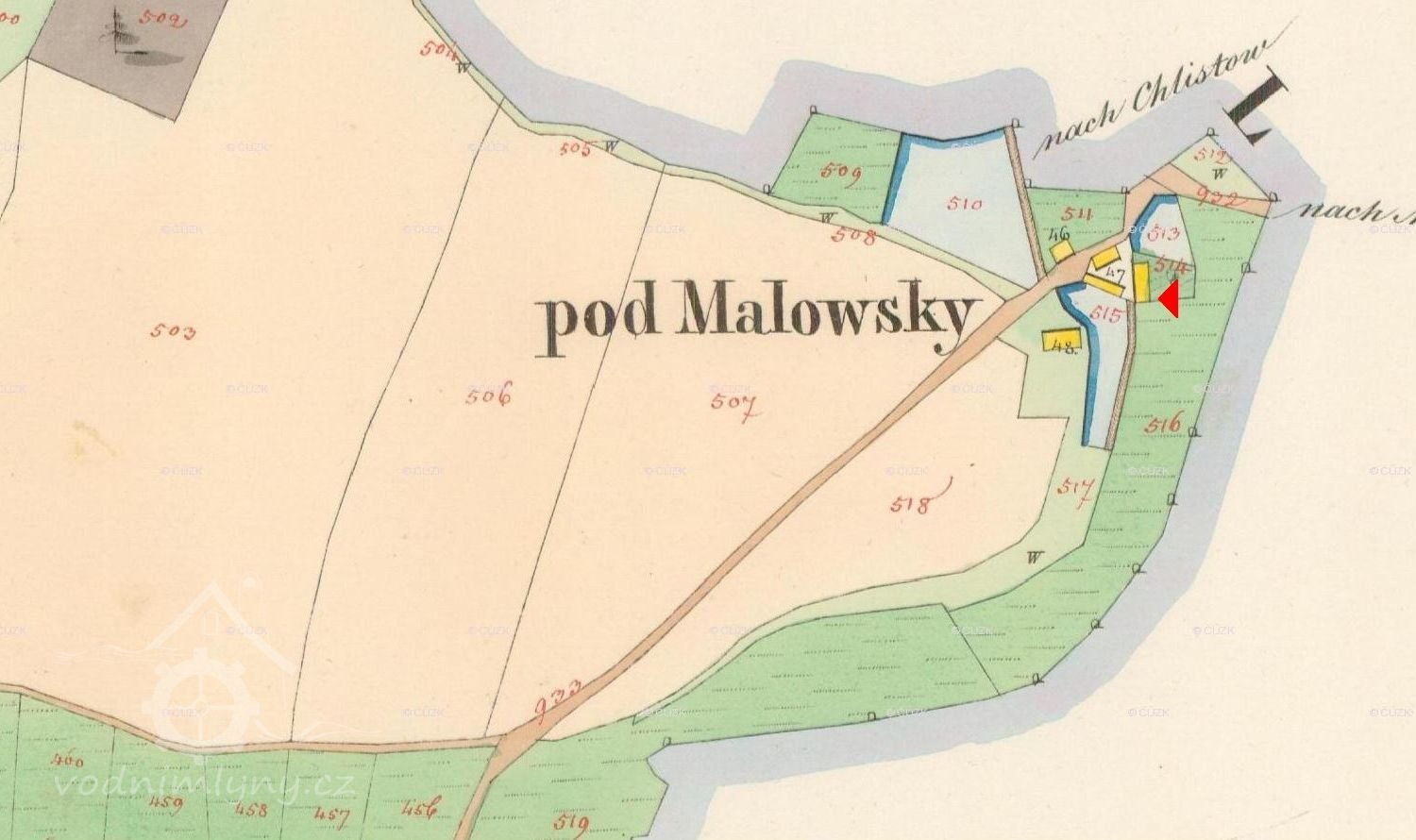 V údolí Podmalovického potoka mezi Malovicemi a Chlístovem stojí (ještě) zbytky roubeného mlýna, jen málo dotčeného přestavbami. Mlýn je opuštěný a pomalu chátrá