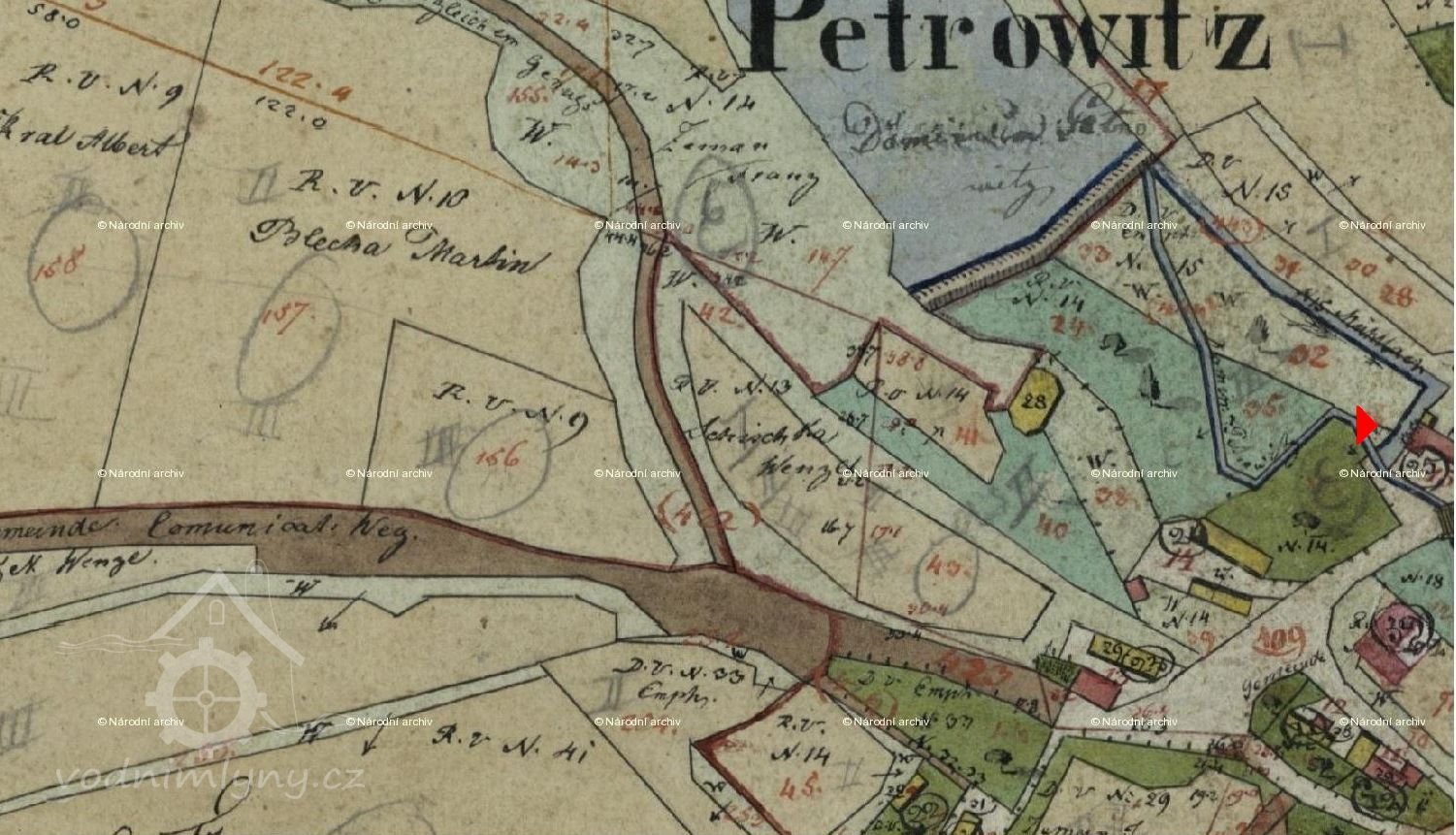 1. zápis: Živnost mlynářská, dvě vodní kola, jedno žene mlýnské složení, druhé stoupy. Voda přichází z rybníka žlabem a strouhou. Vodní kolo mlýnské v průměru 14´9´´, šířka 2´4´´. Vodní kolo stupní v průměru 9´8´´, šířka 2´. Normální znamení zasazeno v roce 1891.