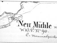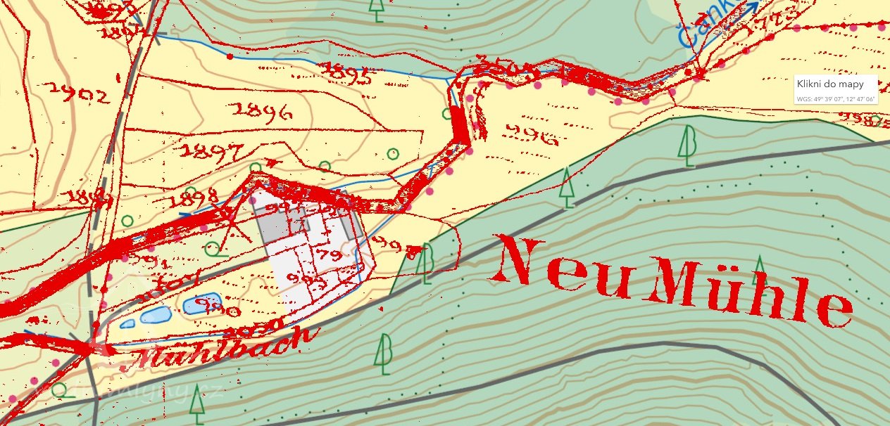 Novodobě upravený areál mlýna na Čankovském potoce na kraji osady Valcha; na mapách stabilního katastru je označen jako Neu Mühle (obě budovy jsou značeny žlutě).