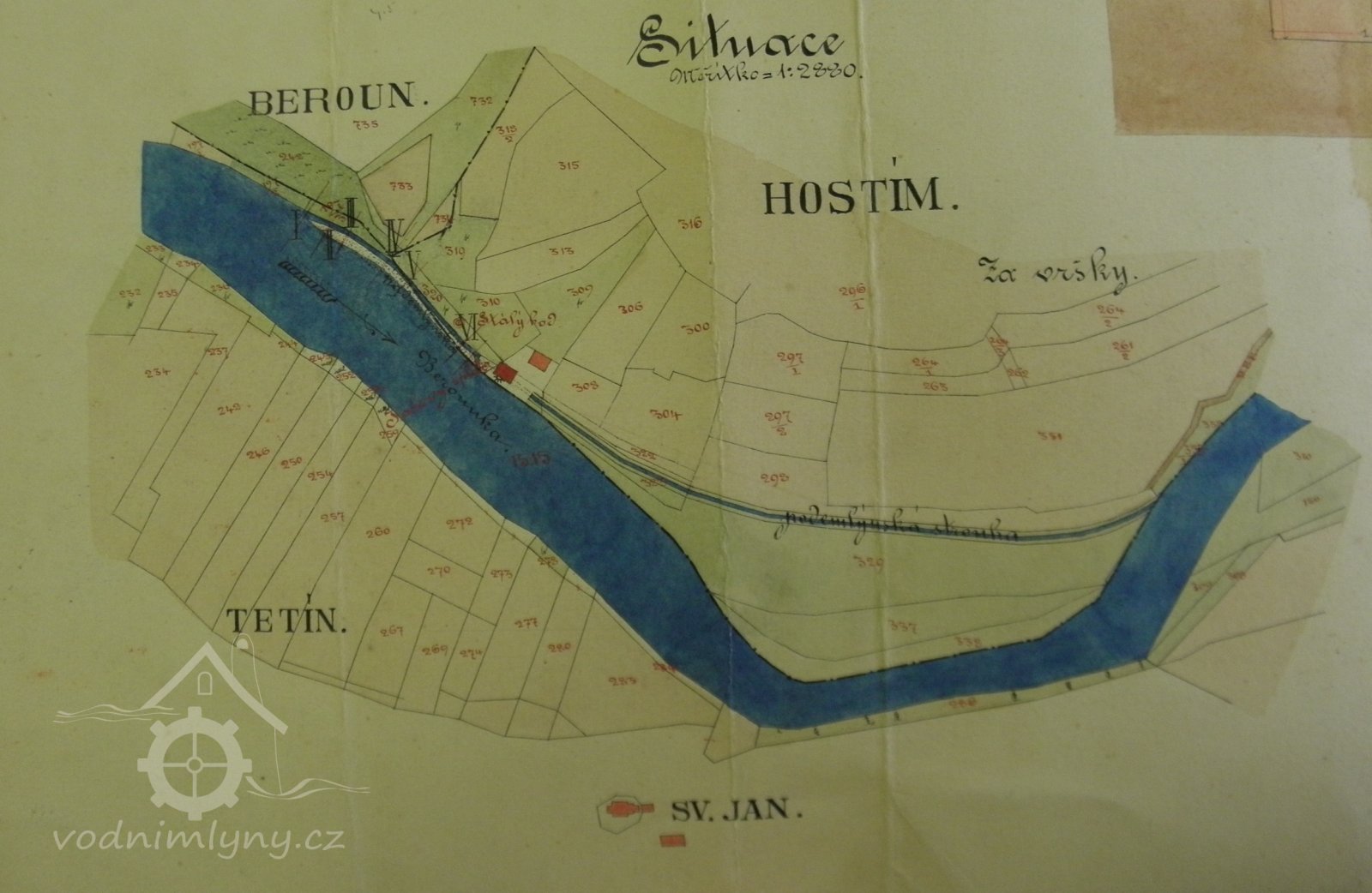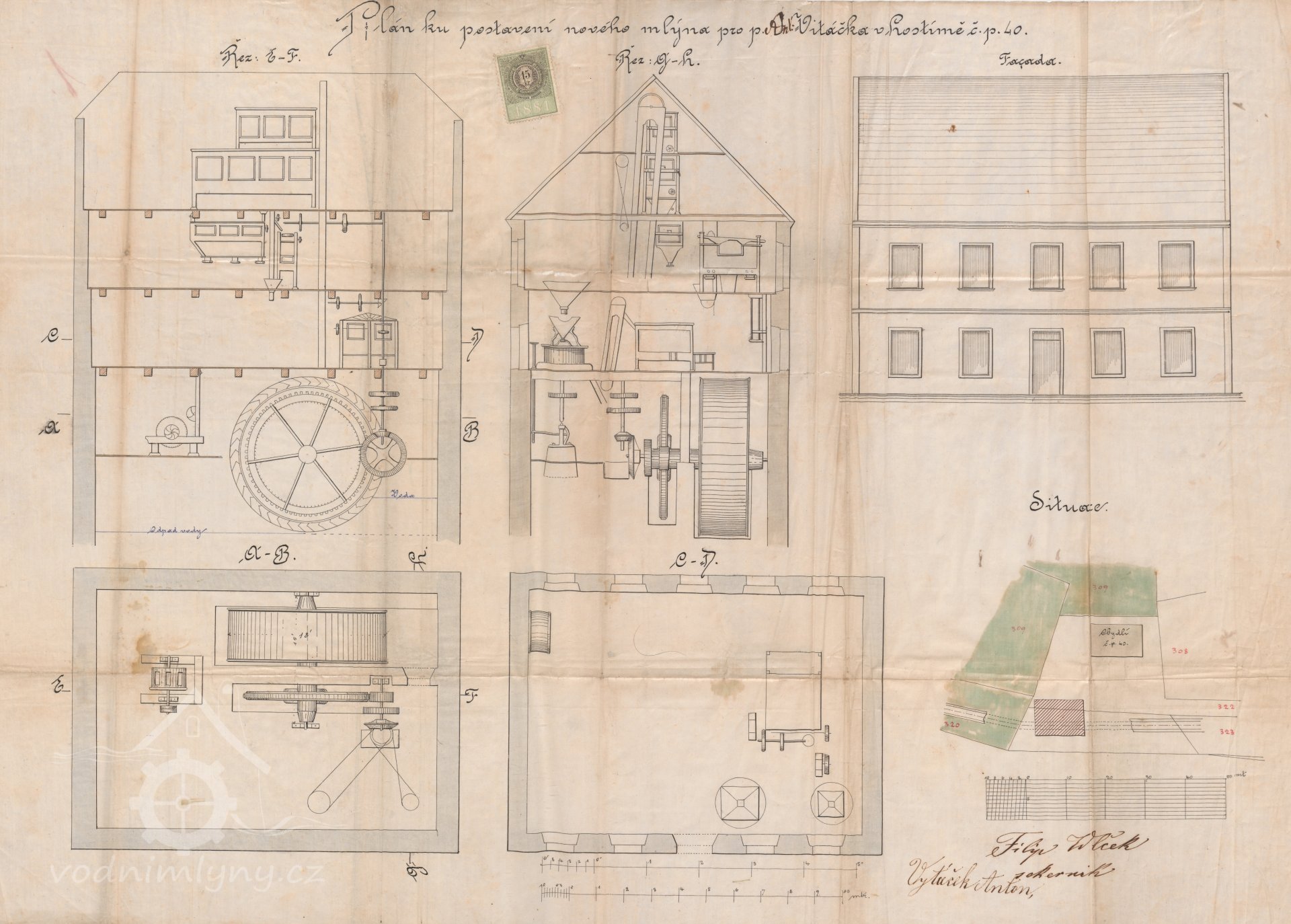 Se jménem Vitáček se setkáváme již na Indikační skice z roku 1840, kdy pozemky, na nichž později mlýn vznikl, vlastnil Josef Vitáček, Hostim čp. 13, tedy dědeček pozdějšího stavitele mlýna Antonína (narozen 21. dubna 1858). Z matrik se také dozvídáme, že otcem Antonína byl Ivan Vitáček. Letmý pohled na Indikační skicu nám naznačí, že usedlost čp. 13 se skládala ze tří spalných a jedné nespalné budovy a patřilo k ní poměrně dost pozemků. Z dalších matričních záznamů zjistíme, že po Ivanovi Vitáčkovi sedí na gruntu jeho syn Josef (několika jeho dětem šel bratr Antonín za kmotra). Zdá se tedy, že Antonín byl ze statku bratrem Josefem nějakým způsobem vyplacen a tak mohl na rodinných pozemcích u řeky postavit patrový zděný dům čp. 40, stodolu a mlýnici. Ve kterém roce byl položen základní kámen mlýna, přesně nevíme. Sám Vitáček udává do protokolu z roku 1906 rok výstavby 1879. K provozování mlýna, však došlo nejspíše až po 25. září 1881, kdy Antonín Vitáček podává žádost na „Slavné c. k. okresní hejtmanství“ a uvádí ji větou: „Od více sousedních obcí, zejména v Hostímě, v Tetíně a v Srbsku byv povzbuzen, uzavřel jsem na své usedlosti čís. pop. 40 v Hostímě mlýn zříditi a k tomu vodní síly z řeky Berounky upotřebiti.“ K této žádosti přiložil i „prohlášení“ podepsané od starostů tří výše zmíněných obcí s tím, že proti „stavbě mlýna nejnovějšího způsobu a stroji k broušení kamenné dlažby“ nic nemají, naopak nový podnik uvítají. Osvědčení, technické dobrozdání od úředně oprávněného civilního inženýra ze 4. ledna 1882 popisuje budovu jako „stavení ve kterémž mlýnské stroje způsobu tak zvaného amerikánského umístěny býti mají.“ Z toho a dalších částí protokolu lze usuzovat, že strojní vybavení bylo nainstalováno až po tomto datu. Povolení provozovat mlynářskou živnost a postavit mlýn dostal Vitáček 29. dubna 1882. Kolaudace byla 11. června 1883. Kvůli nepřesnému zaměření nového náhonu proběhla v roce 1888 opětovná nivelace a do skály nad cestou bylo vytesáno normální znamení.