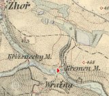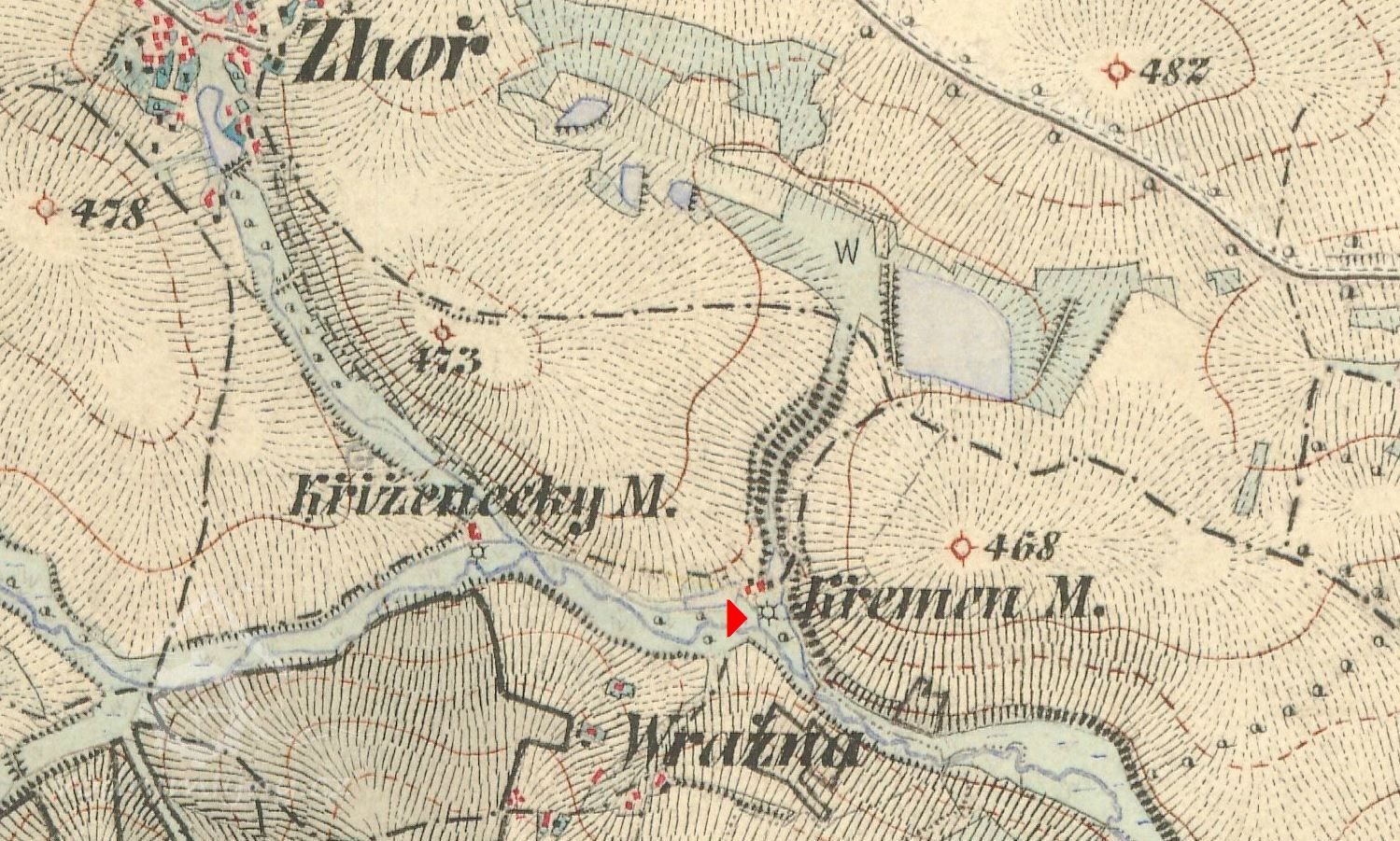 1888 nivelování jezu na Novoveském potoce pro mlýn čp. 17 (Špirytův) a čp. 18 Karla a Anny Křemenových (Jonášův): "užitečný spád od lednice mlýna hořejšího čp. 17 ve Zhoři, manželům Františku a Anně Voděnkových patřícího, až do vtoku do nademlejnské strouhy, k vašemu mlýnu čp. 18 obnášeti bude do 0,115 m tento spád, jenž nyní obnáší 0,352 m, byl však již před rokem 1871 tak malý a muselo tedy , an manželé Voděnkovi tvrdí, že se při tomto spádu kolo mlýnské u mlýna jejich čp. 17 ve Zhoři při velké vodě brodí a topí, že když se toto vodní kolo v roce 1882 z průměru 2,84 m na průměr 3,16 zvětšilo, v jakéž velikosti se nyní nalézá, nebylo tak postiženo, aby spodkem svým přišlo do výšky spodku bývalého kola menšího. Výnosem úředním ze dne 16.5.1882 č. 4047 bylo tehdejším majitelům mlýna čp. 17 ve Zhoři pouze pod shora uvedenou podmínkou povoleno zvětšení mlýnského kola."