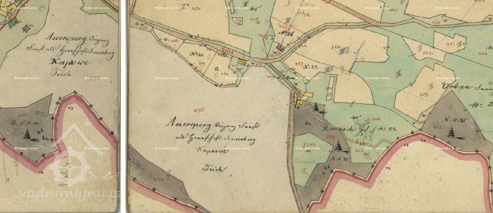 Pod Kaprovým rybníkem se od 17. století připomíná Možděnický mlýn čp. 22. Měl jedno složení s krupníkem a pohon kolem na vrchní vodu o průměru 379 cm a šířce 48 cm.