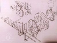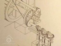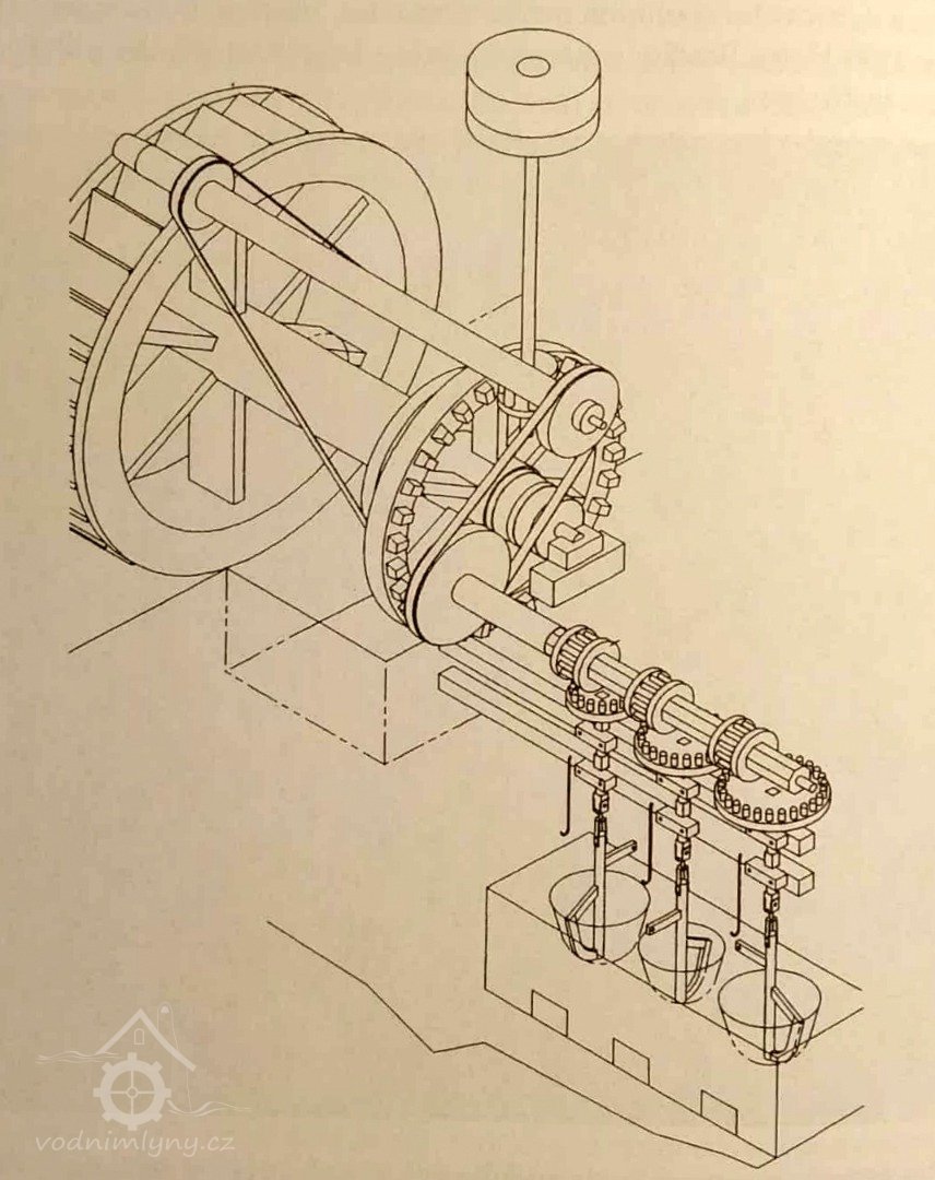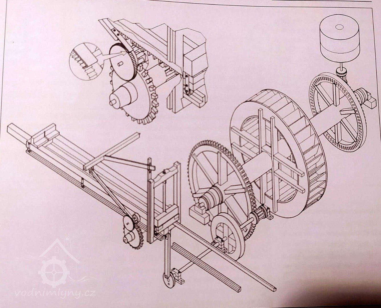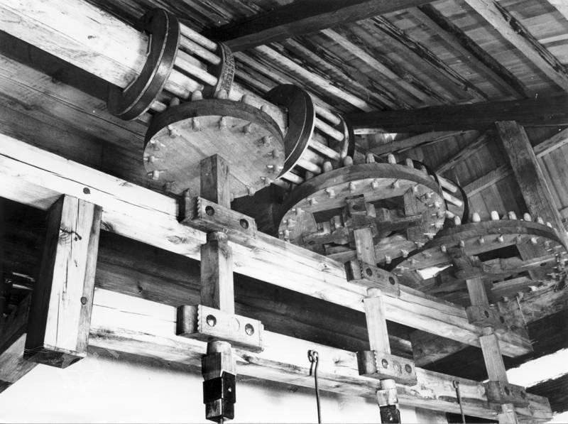 Palečné kolo, 07 2022, © Josef Holub, (Prvky na obrázku: transmise, řemenice, převody - paleční kola, pastorky a cévníky (řemeslný výrobek))
