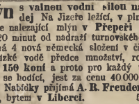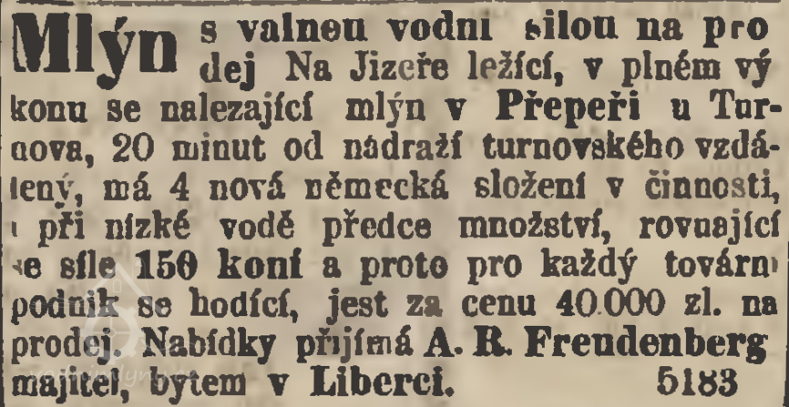 Mlýn byl v r. 1874 na prodej. Koupil ho 1875 Augustin R. Freudenberg, druhdy knihař v Liberci, později majitel velkostaku Navarova. Mlýn vybavil nový stroji a pronajímal jej. (RR)