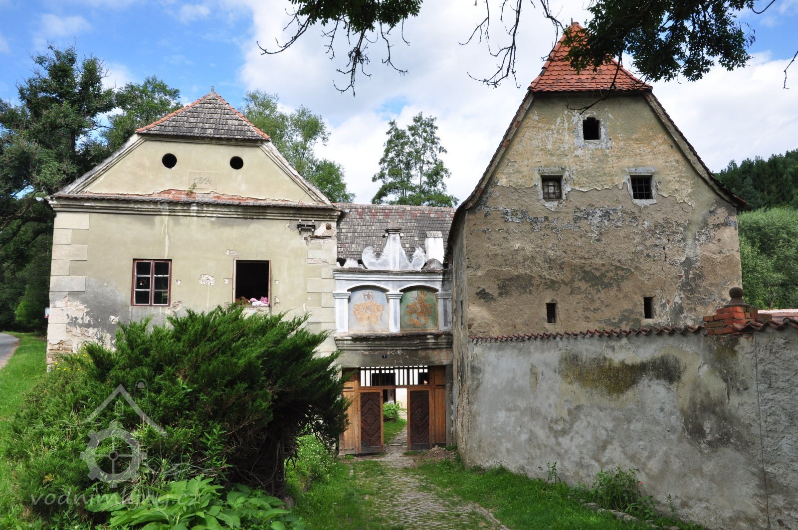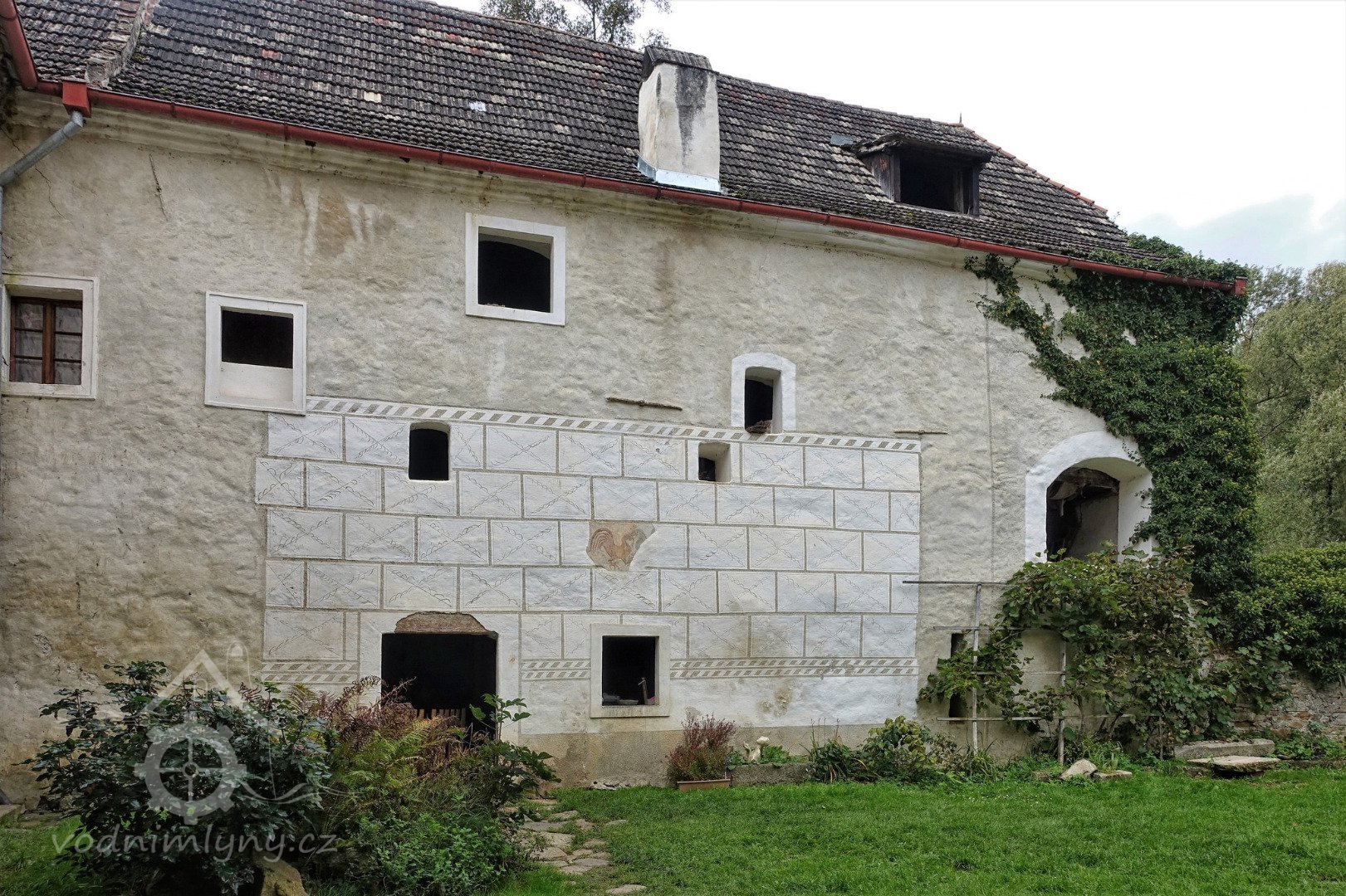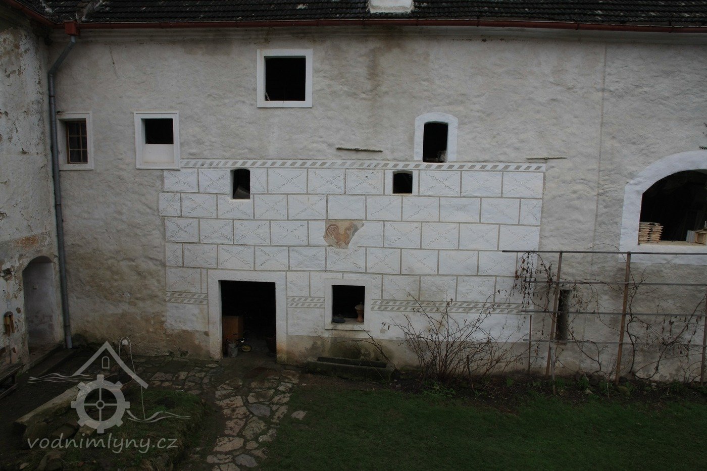 Pohled na mlýnici ze sýpky, 2013, © Šimek, (Prvky na obrázku: malovaná výzdoba fasád a štítů, sgrafito, rytá výzdoba)