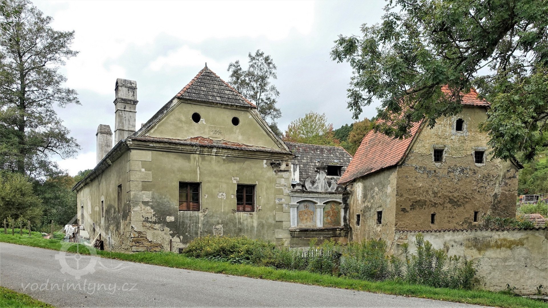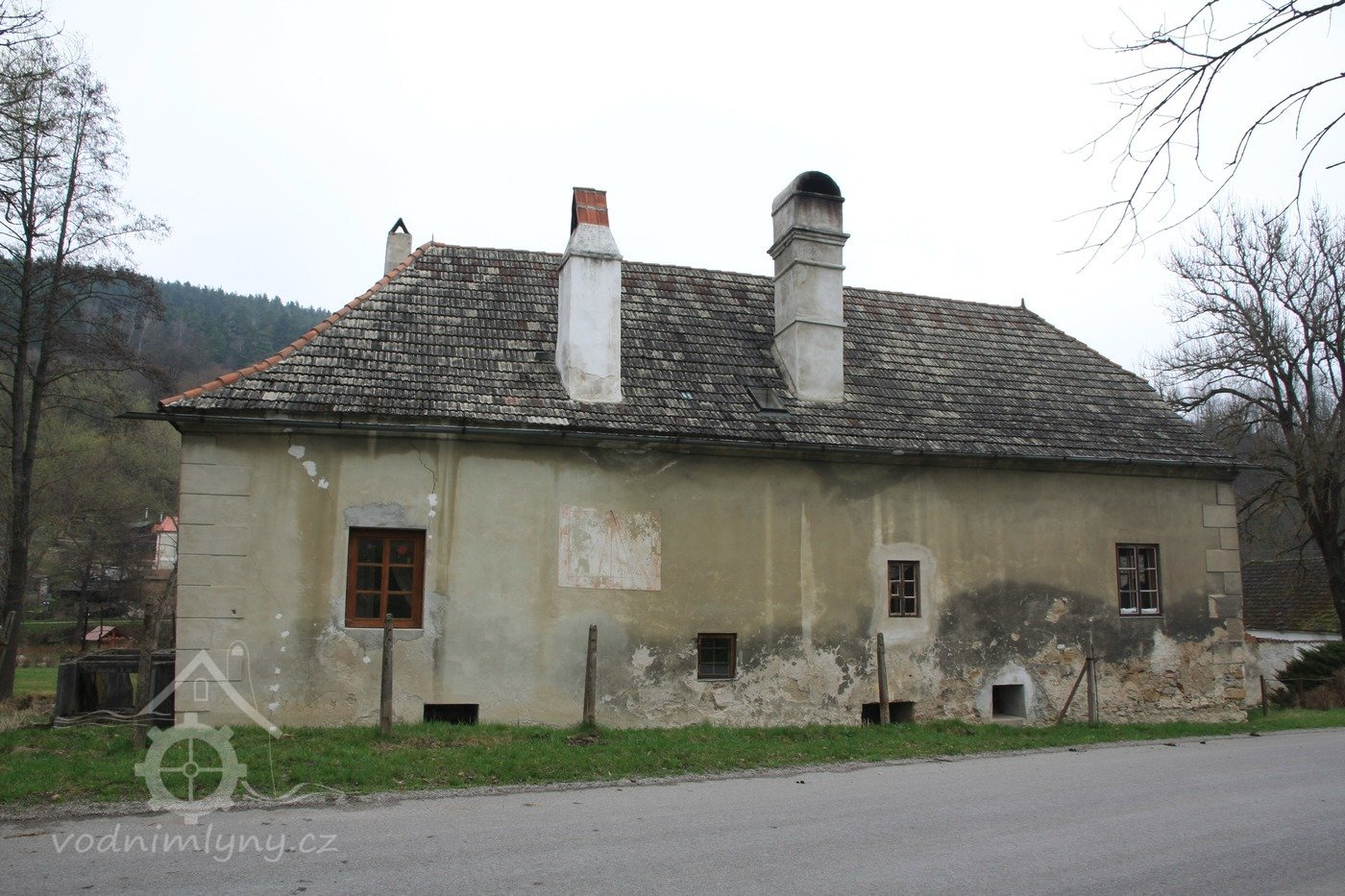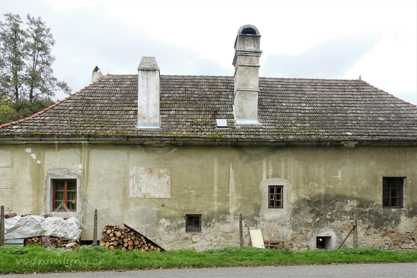 Pohled na obytnou část mlýna ze silnice, 2013, © Šimek, (Prvky na obrázku: plastická omítková výzdoba fasád a štítů, komín)