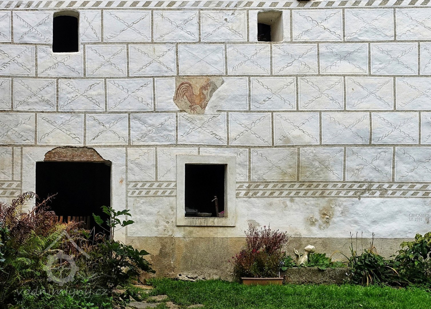 Detail goticko-renesančního zdiva, 1999, © Jaroslav Kopecký, (Prvky na obrázku: sgrafito, rytá výzdoba)