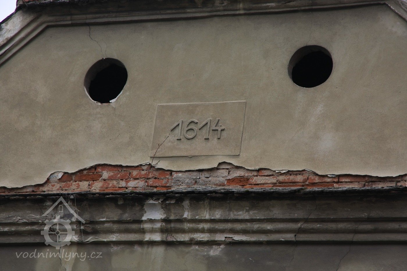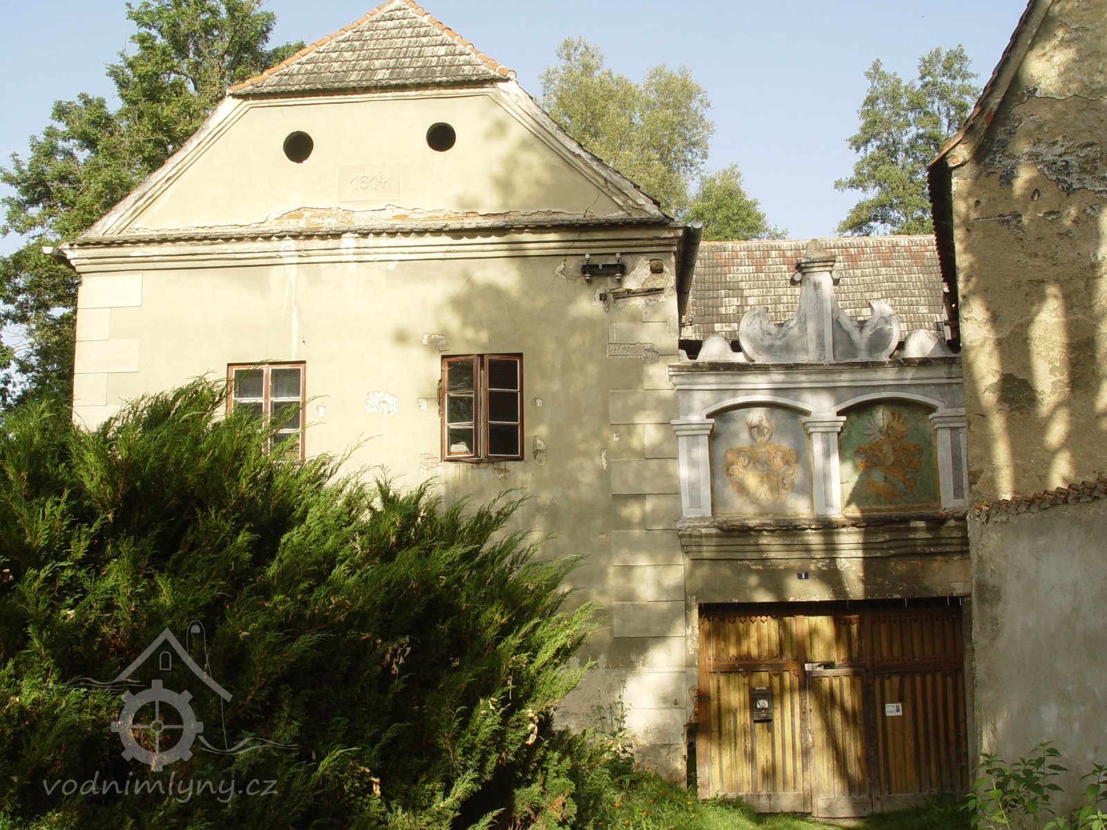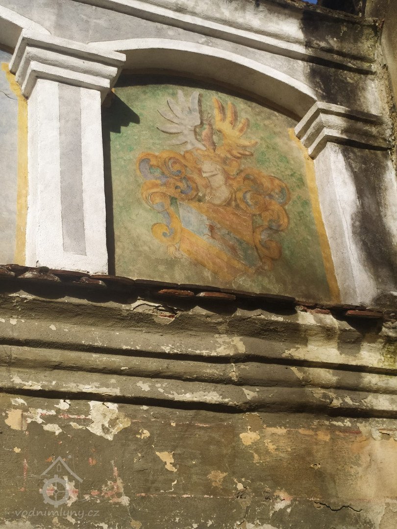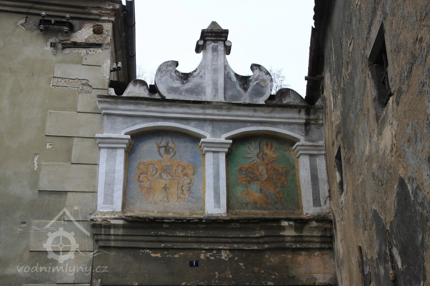 Ozdobný štít nad hlavní vstupní branou do mlýna, 2013, © Šimek, (Prvky na obrázku: plastická omítková výzdoba fasád a štítů, zdobený zděný štít, umělecké prvky (sochy, malby, reliéfy))