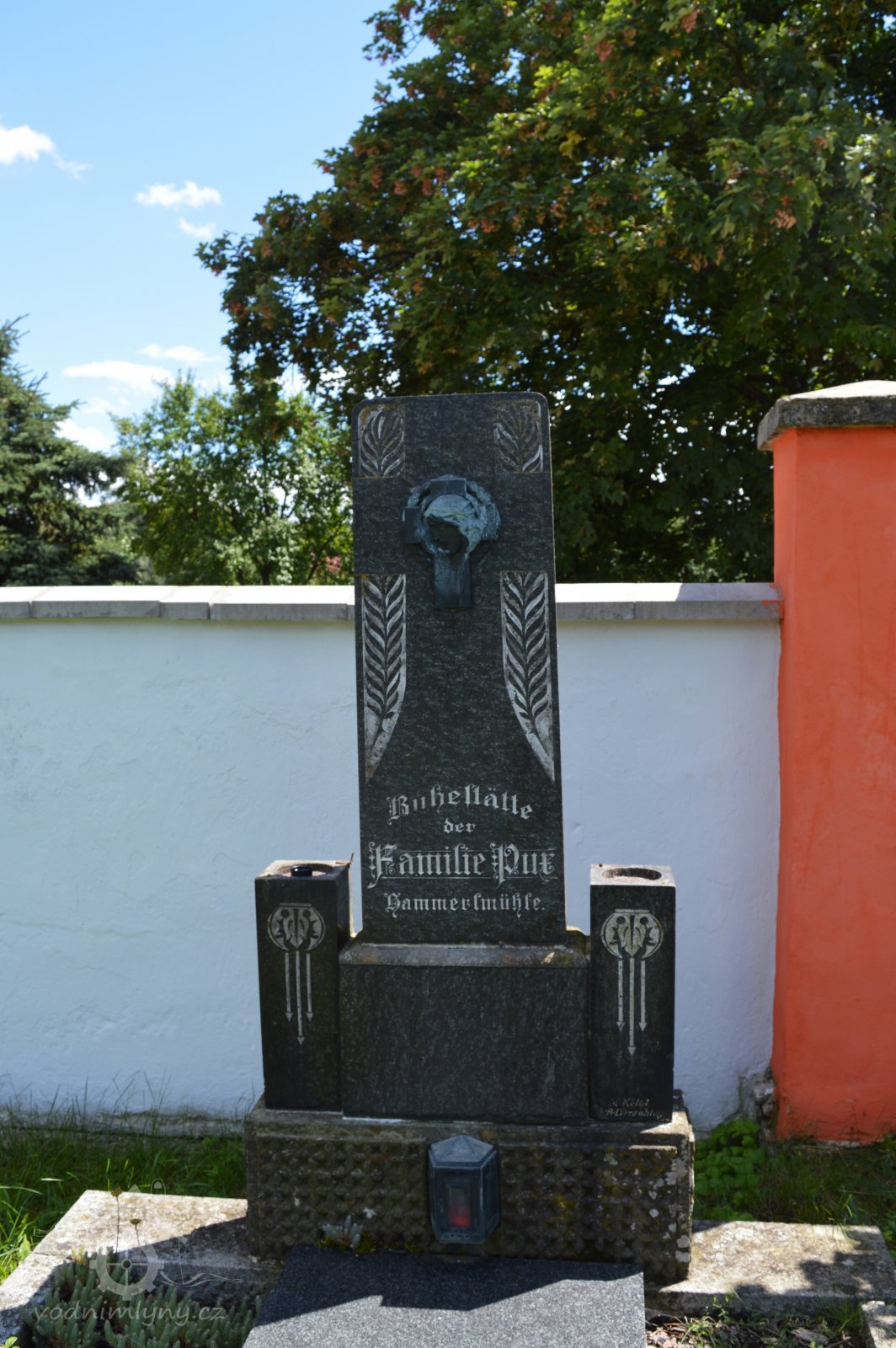 Hrobka mlynářského rodu Puxu na hřbitově v Kájově, 30.7.2016, © Racocha, (Prvky na obrázku: náhrobky, pamětní desky)