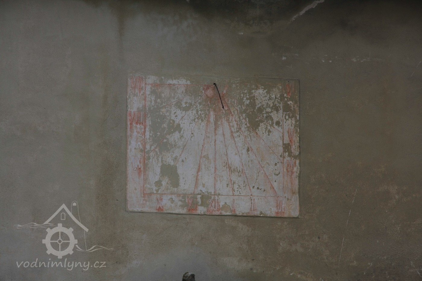 Sluneční hodiny na jižní zdi obytné části mlýna, 2013, © Šimek, (Prvky na obrázku: malovaná výzdoba fasád a štítů)