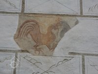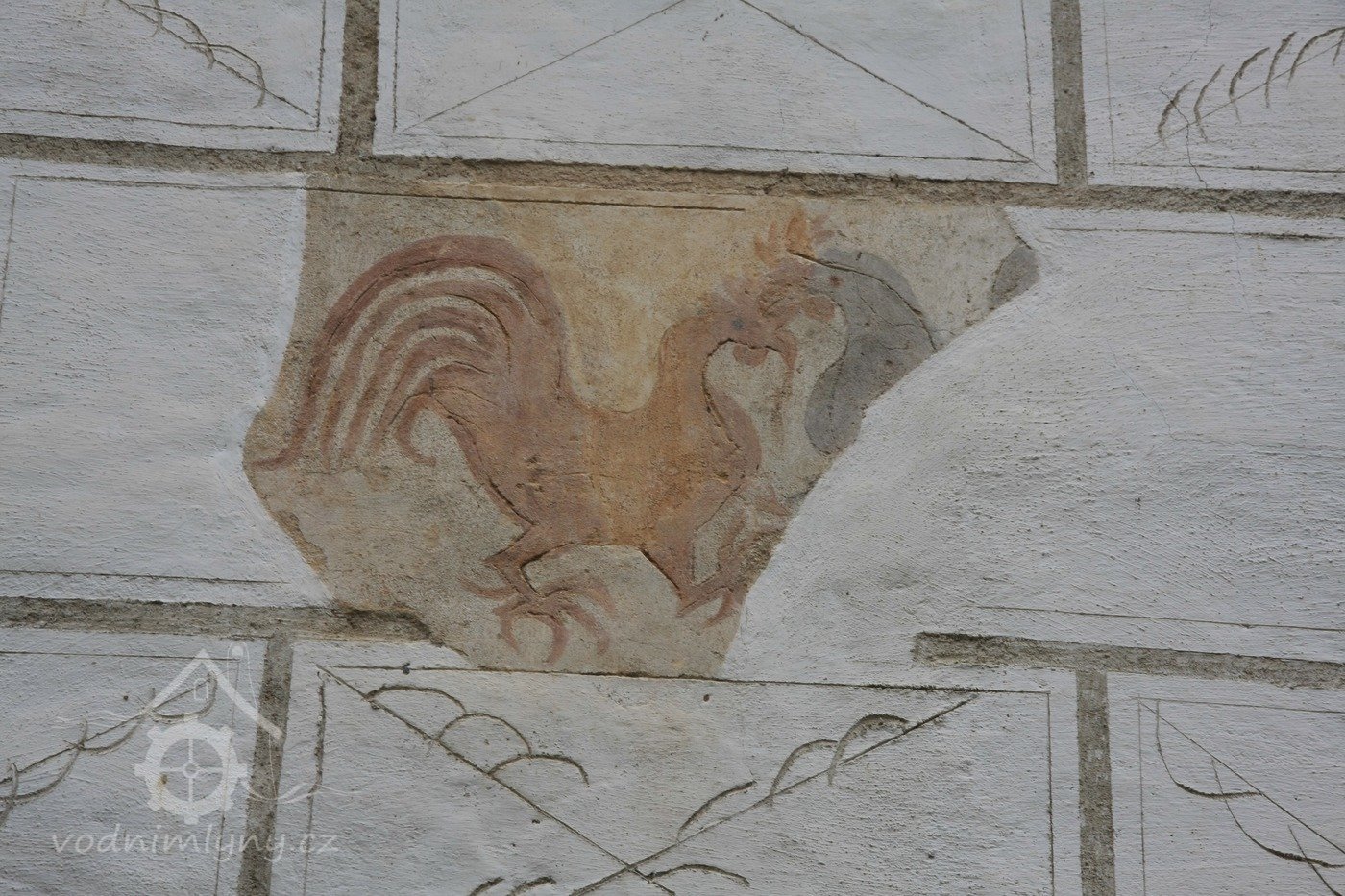 Dva bojující kohouti - zrestaurovaná freska na východní zdi mlýnice, 2013, © Šimek, (Prvky na obrázku: malovaná výzdoba fasád a štítů, umělecké prvky (sochy, malby, reliéfy), sgrafito, rytá výzdoba)