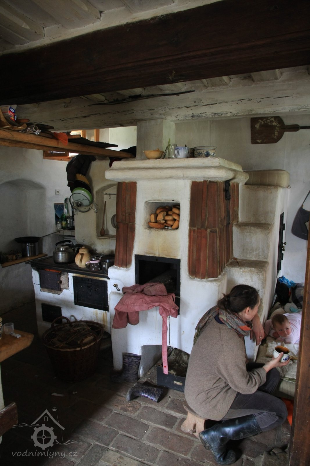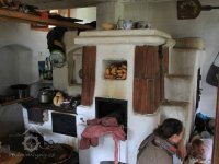 Pohled na otopné zařízení, 2013, © Šimek, (Prvky na obrázku: trámový strop, topeniště, kamna, pec)
