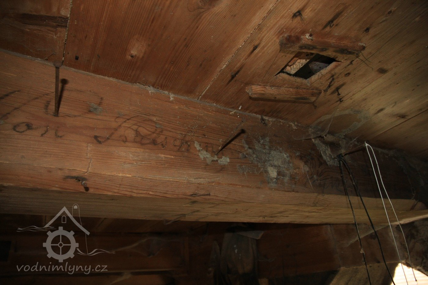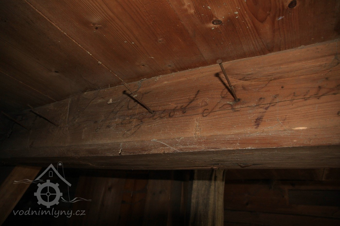 Německý nápis na trámu v mlýnici, 2013, © Šimek, (Prvky na obrázku: epigrafické památky (nápisy, datování aj.))