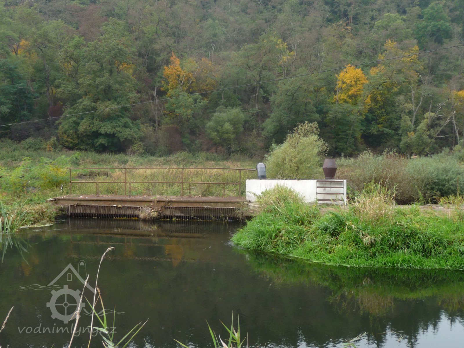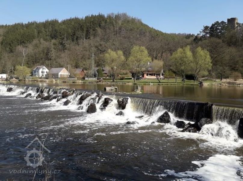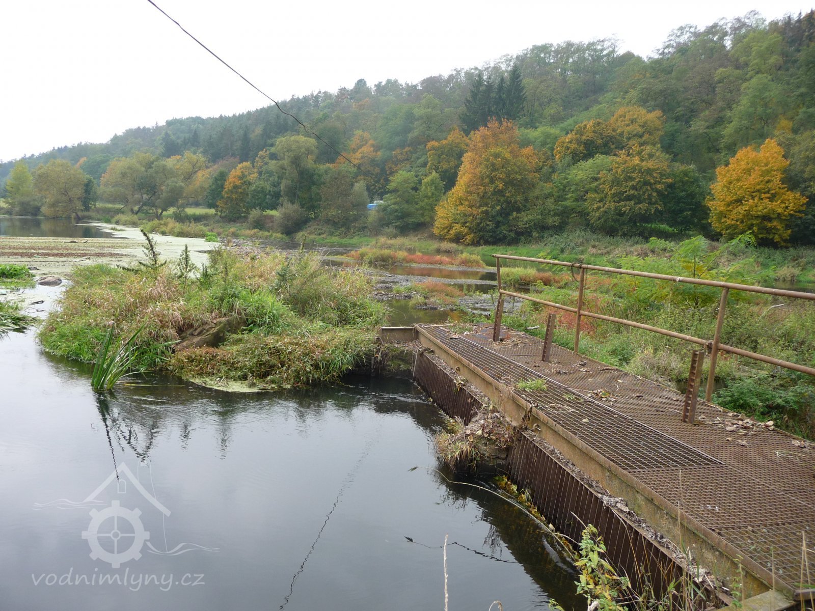 Na řece Berounce šikmo stojící, pevný, přepadový jez. Voda jezem vzdutá přitéká tak zvanou jímkou ke stavidlům a těmito na mlýnská kola. Stavidla jsou tři, prvá dvě mlýnská, třetí je jalové. Ve žlabu prvním visí dvě, ve druhém jedno kolo na spodní vodu. Těmi se ženou tři složení. (jšk)