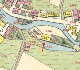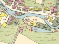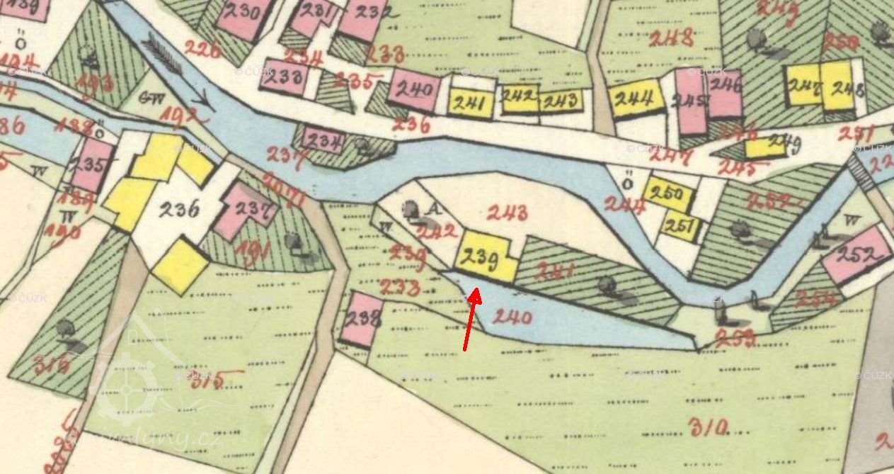 Stavení pochází s jistotou z doby před rokem 1843, neboť je zakresleno v mapách stabilního katastru. Půdorysná stopa, zaznamenaná v povinném otisku i v indikační skice, se neliší a je shodná se současným stavem. Dům včetně přístavku je zde vyznačen žlutě jako spalný. Oproti současnému stavu resp. skutečnosti je ve skice za hlavní označené západní štítové průčelí, jde však zřejmě o mýlku, případné změně orientace domu by snad mohlo odpovídat pouze nezvyklé umístění kuchyně v síni u vchodu. Mapy stabilního katastru rovněž napovídají, že šlo původně o mlýn, přímo na hraně jižního podélného průčelí je zakreslen protáhlý drobný rybník napájený náhonem, v indikační skice je navíc k jižní fasádě tužkou přikreslen piktogram vodního kola.
