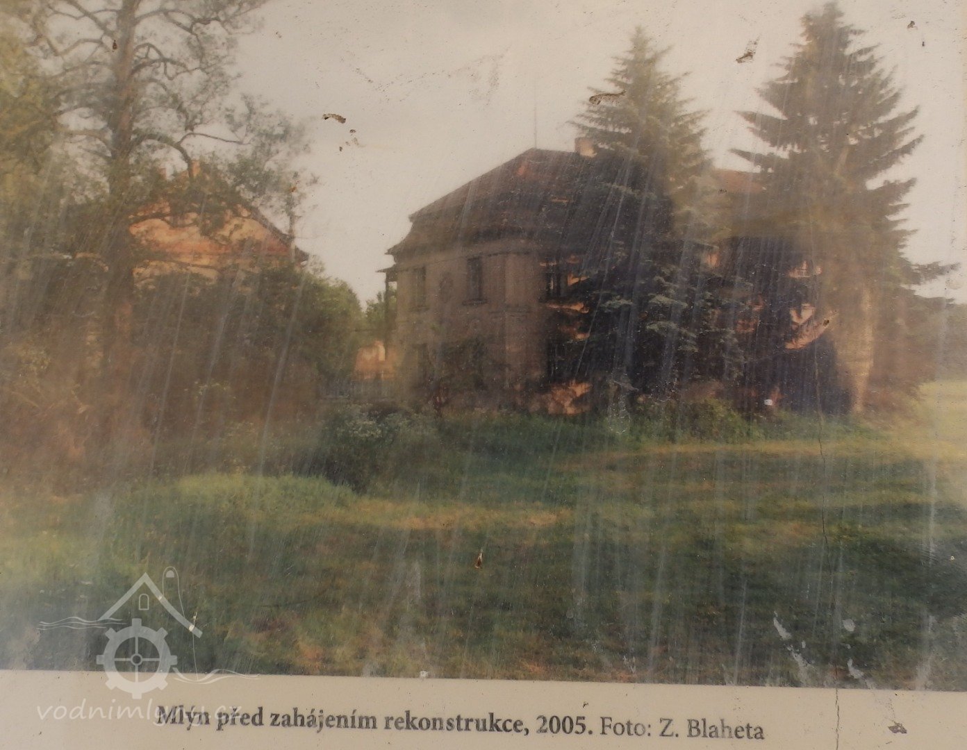 Vlevo od vstupní brány je původní, pravděpodobně nejstarší budova mlýna, sestávající z obytné části a mlýnice. Na ni navazuje dvoupodlažní sýpka, která uzavírá východní stranu dvora. Dvorní průčelí budovy má 5 okenních os. V přízemí jsou ve dvou osách vstupní dveře /dvojkřídlé, dřevěné /. Severní stěna se štítem orientovaná vně dvora má v přízemí 3 v patře dvě a ve štítě dvě okenní osy. Východní stěna, k níž je přistavěna elektrárna, má dvě okenní osy. V úrovni patra se nachází dřevěná pavlač, na kterou je možné vstoupit dveřmi ze šalandy nebo po jednoramenném dřevěném schodnicovém schodišti ze zahrady. Fasáda je bez ozdob, vodorovně dělená kordonovou římsou. Podokapní římsa profilovaná. Obytná část sestává ze dvou obytných místností a chodby s původní pecí. Inventář z velké části původní, zachovalý, /malované skříně, truhly, nádobí.../ V jižní části přízemí byla při přestavbě v r. 1940 prohloubena podlaha přibližně o 1 m pod úroveň dvora a byla zvýšena původní podlaha přízemí. Vznikl tak suterén, do kterého byly umístěny transmise, elektromotor pro pohon mlýnských strojů, vč. rozvodné a ovládací desky. V zvláštní místnosti s předsíňkou byl umístěn stabilní naftový motor Škoda /z r. 1932/. Výfukové potrubí je vedeno po vnější stěně souběžně s okapem a je ukončeno nad římsou. Do zvýšeného přízemí byly umístěny těžké mlýnské stroje - tj. pšeničná a dvě žitné stolice a "francouzský kámen". Dřevěné násypky strojů procházejí do patra, kam byly také umístěny vysévače /pšeničný, žitný/, čistící stroj a míchací komora na mouku. V severovýchodním rohu patra je tzv. šalanda, sestávající ze dvou místností, oddělených od prostoru mlýnice lehkou příčkou. Lehké stroje byly umístěny také do půdního prostoru: třídič pšeničný, žitný a vysévače. Vertikální doprava zajištěna obvyklými kapsovými dopravníky v dřevěných šachtách. Všechna schodiště provedena jako schodnicová, dřevěná. Stropní konstrukce a krovy jsou dřevěné, střešní krytina pálená, je provedena z bobrovek /korunové/. Střecha sedlová. Všechna okna jsou také dřevěná, dvojkřídlá. Každé křídlo děleno vodorovně do 4 polí. V obytné části jsou okna dvojitá, jinak jednoduchá. Jsou /podobně i dveře/ mořena do tmavého odstínu.