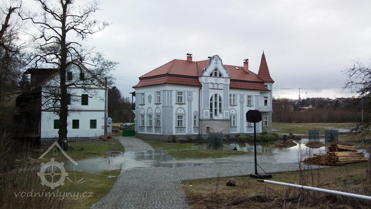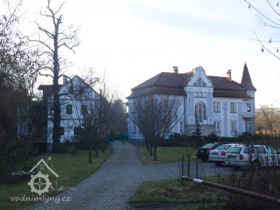 V úrovni přízemí pokračuje vlevo od hlubší části rizalitu, zakryté pultovou střechou, nesenou dřevěnou konstrukcí. Ta je pojata tak, aby opakovala motiv oblouku, včetně ozdob. Vpravo na rizalit v úrovni patra navazuje lodžie, krytá pultovou střechou. Nosná konstrukce střechy je dřevěná, opět třikrát opakuje motiv oblouku v přízemí, i když v trochu odlišné podobě. Rizalit má tři okenní osy, v nichž dvě se nacházejí na jeho hlubší části. Tyto okenní osy jsou shodné s osami oblouků v přízemí. Vlevo od rizalitu je možné v úrovni patra nalézt dvě okenní osy /v té vzdálenější jsou dveře na terasu mezi vilou a navazujícími stájemi/. Vpravo od rizalitu zbývá ještě jedna okenní osa, v níž jsou na rozdíl od všech ostatních dvojdílných oken umístěna okna trojdílná. Všechna okna včetně rámů, dveří, zárubní, zábradlí jsou ze dřeva, opatřena bílým nátěrem. Z téhož materiálu jsou všechny krovové a většina stropních konstrukcí. Střecha je mansardová, přičemž spodní část představuje asi třetinu výšky střechy. Krytina pálená - drážkovky. Přízemí vily sloužilo spíše jako plocha provozní, - tj. kuchyně, chodba, hala, kancelář mlynáře /dodnes s původním inventářem/, sociální zařízení. Podlahy přízemí jsou opatřeny keramickými dlaždicemi s výjimkou haly a schodiště, kde byl použit bílý a růžový leštěný mramor. Téměř všechny dveře i zárubně v interiérech jsou zdobeny secesními motivy, zvýrazněnými zlacením. Pozornost si zaslouží mj. i leptané skleněné výplně oken na schodišti /rostlinné motivy/ a dvoukřídlých vstupních dveří do haly /zjednodušený pohled na původní mlýn s vodním kolem/. Schodiště je trojramenné, mezipodesty zdobeny dvoubarevnými mozaikami z leštěného mramoru. Zábradlí dřevěné, zdobené. V hale nad schodištěm j e dřevěný kazetový strop se secesními osvětlovacími tělesy. V patře je obývací pokoj, pánský pokoj /pracovna/, ložnice, pokoje pro hosty a koupelna. Podlahy kryty parketami, v pokojích z větší části zachován i původní, často secesní inventář, vč. válcových kachlových kamen.
